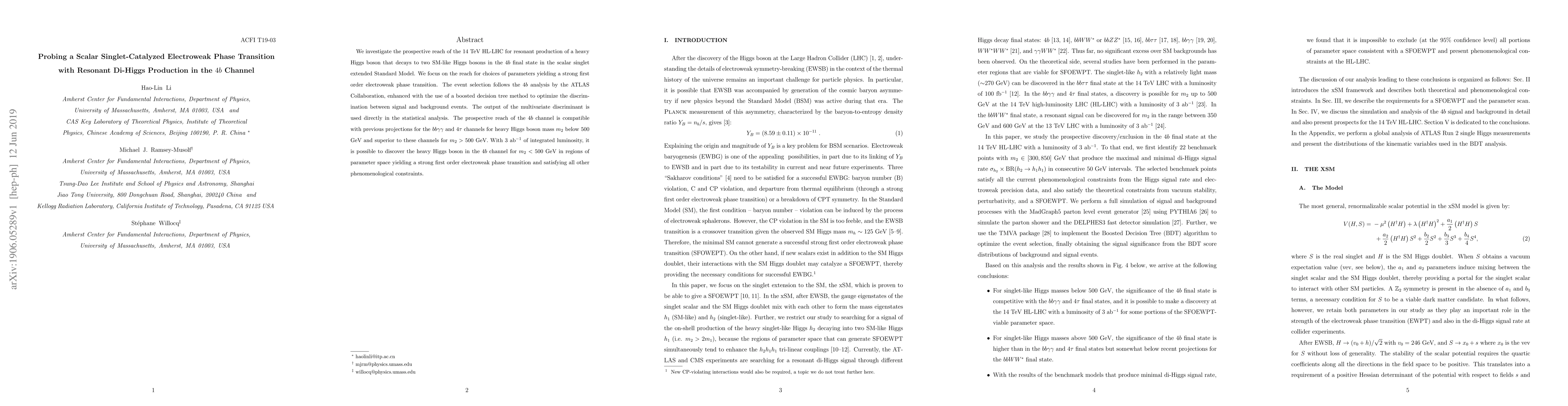 We investigate the prospective reach of the 14 TeV HL-LHC for resonant production of a heavy Higgs boson that decays to two SM-like Higgs bosons in the $4b$ final state in the scalar singlet extended Standard Model. We focus on the reach for choices of parameters yielding a strong first order electroweak phase transition. The event selection follows the $4b$ analysis by the ATLAS Collaboration, enhanced with the use of a boosted decision tree method to optimize the discrimination between signal and background events. The output of the multivariate discriminant is used directly in the statistical analysis. The prospective reach of the $4b$ channel is compatible with previous projections for the $bb\gamma\gamma$ and $4\tau$ channels for heavy Higgs boson mass $m_2$ below 500 GeV and superior to these channels for $m_2 > 500$ GeV. With 3 ab$^{-1}$ of integrated luminosity, it is possible to discover the heavy Higgs boson in the $4b$ channel for $m_2< 500$ GeV in regions of parameter space yielding a strong first order electroweak phase transition and satisfying all other phenomenological constraints.