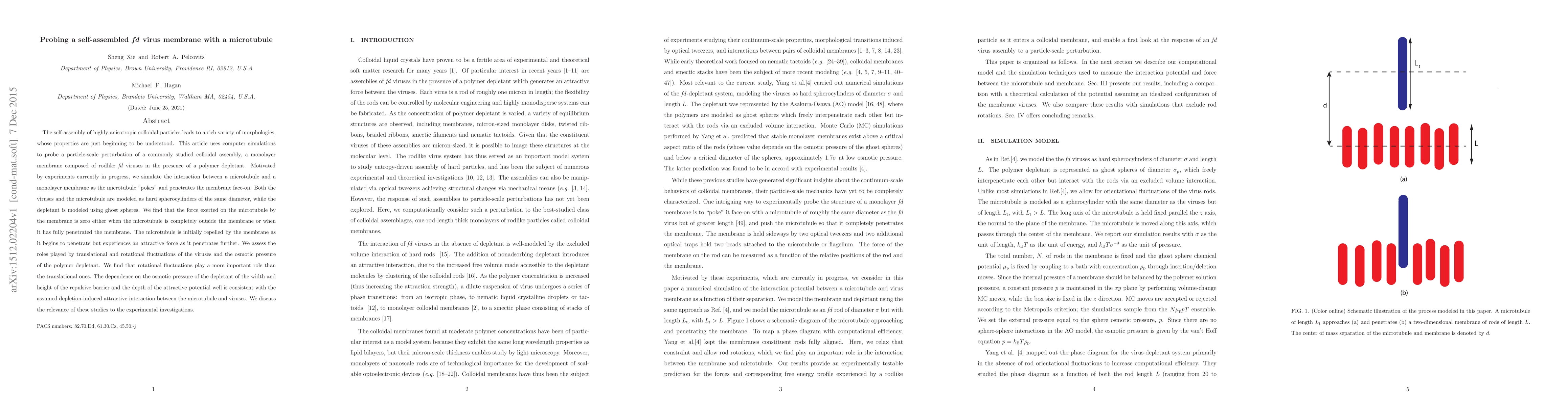 The self-assembly of highly anisotropic colloidal particles leads to a rich variety of morphologies, whose properties are just beginning to be understood. This article uses computer simulations to probe a particle-scale perturbation of a commonly studied colloidal assembly, a monolayer membrane composed of rodlike fd viruses in the presence of a polymer depletant. Motivated by experiments currently in progress, we simulate the interaction between a microtubule and a monolayer membrane as the microtubule "pokes" and penetrates the membrane face-on. Both the viruses and the microtubule are modeled as hard spherocylinders of the same diameter, while the depletant is modeled using ghost spheres. We find that the force exerted on the microtubule by the membrane is zero either when the microtubule is completely outside the membrane or when it has fully penetrated the membrane. The microtubule is initially repelled by the membrane as it begins to penetrate but experiences an attractive force as it penetrates further. We assess the roles played by translational and rotational fluctuations of the viruses and the osmotic pressure of the polymer depletant. We find that rotational fluctuations play a more important role than the translational ones. The dependence on the osmotic pressure of the depletant of the width and height of the repulsive barrier and the depth of the attractive potential well is consistent with the assumed depletion-induced attractive interaction between the microtubule and viruses. We discuss the relevance of these studies to the experimental investigations. \end{abstract}