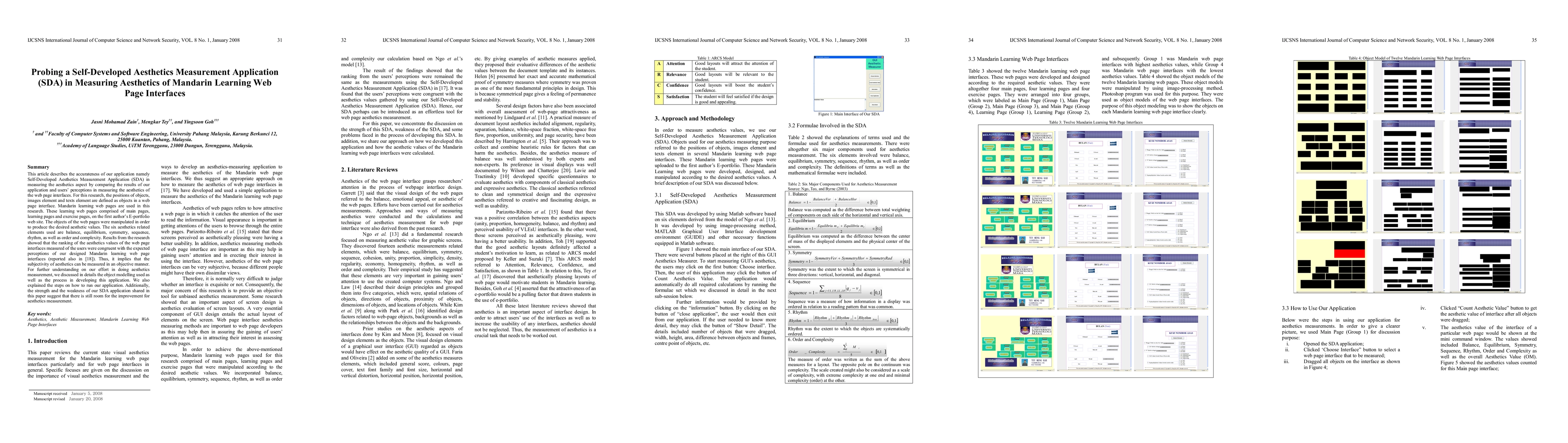 This article describes the accurateness of our application namely Self-Developed Aesthetics Measurement Application (SDA) in measuring the aesthetics aspect by comparing the results of our application and users' perceptions in measuring the aesthetics of the web page interfaces. For this research, the positions of objects, images element and texts element are defined as objects in a web page interface. Mandarin learning web pages are used in this research. These learning web pages comprised of main pages, learning pages and exercise pages, on the first author's E-portfolio web site. The objects of the web pages were manipulated in order to produce the desired aesthetic values. The six aesthetics related elements used are balance, equilibrium, symmetry, sequence, rhythm, as well as order and complexity. Results from the research showed that the ranking of the aesthetics values of the web page interfaces measured of the users were congruent with the expected perceptions of our designed Mandarin learning web page interfaces (reported also in [18]). Thus, it implies that the subjectivity of aesthetics can be measured in an objective manner. For further understanding on our effort in doing aesthetics measurement, we discussed in details the object modelling used as well as the process in developing this application. We also explained the steps on how to run our application. Additionally, the strength and the weakness of our SDA application shared in this paper suggest that there is still room for the improvement for aesthetics measurement.