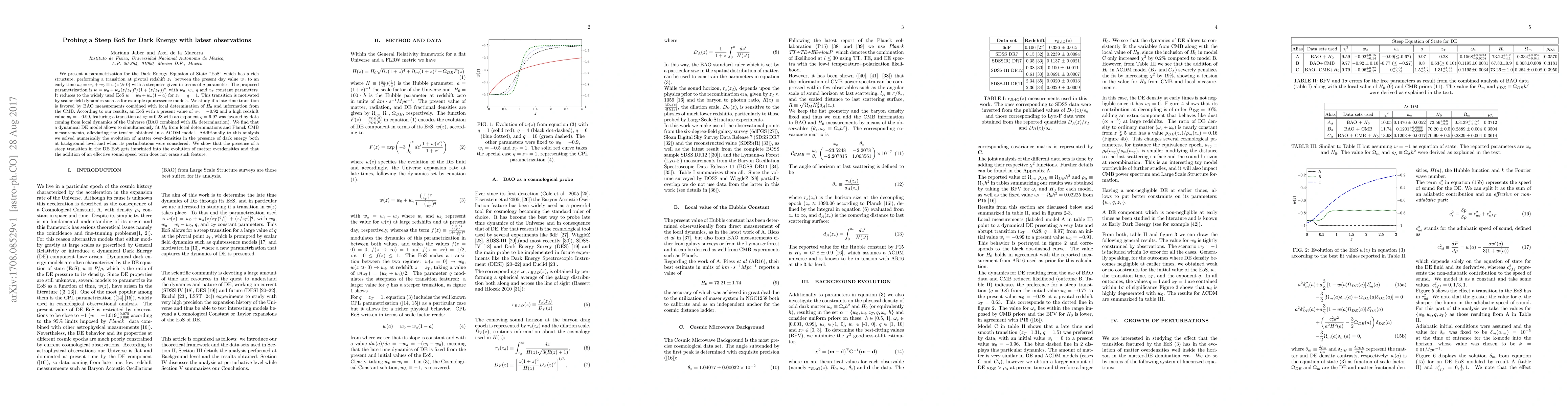 We present a parametrization for the Dark Energy Equation of State "EoS" which has a rich structure, performing a transition at pivotal redshift $z_T$ between the present day value $w_0$ to an early time $w_i=w_a+w_0\equiv w(z\gg0)$ with a steepness given in terms of $q$ parameter. The proposed parametrization is $w=w_0+w_a(z/z_T)^q/(1+(z/z_T))^q$, with $w_0$, $w_i$, $q $ and $z_T$ constant parameters. It reduces to the widely used EoS $w=w_0+w_a(1-a)$ for $z_T=q=1$. This transition is motivated by scalar field dynamics such as for example quintessence models. We study if a late time transition is favored by BAO measurements combined with local determination of $H_0$ and information from the CMB. According to our results, an EoS with a present value of $w_0 = -0.92$ and a high redshift value $w_i =-0.99$, featuring a transition at $z_T = 0.28$ with an exponent $q = 9.97$ was favored by data coming from local dynamics of the Universe (BAO combined with $H_0$ determination). We find that a dynamical DE model allows to simultaneously fit $H_0$ from local determinations and Planck CMB measurements, alleviating the tension obtained in a $\Lambda$CDM model. Additionally to this analysis we solved numerically the evolution of matter over-densities in the presence of dark energy both at background level and when its perturbations were considered. We show that the presence of a steep transition in the DE EoS gets imprinted into the evolution of matter overdensities and that the addition of an effective sound speed term does not erase such feature.