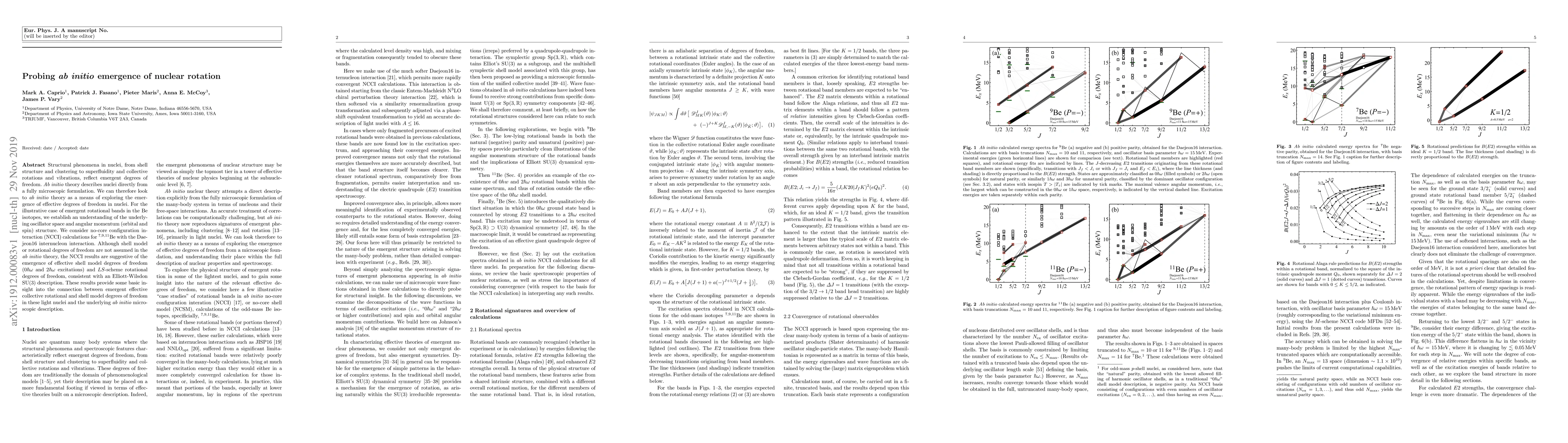 This paper explores the emergence of nuclear rotational bands in Be isotopes using ab initio no-core configuration interaction calculations, revealing the underlying shell model and rotational degrees of freedom despite no initial assumptions of these phenomena. The study provides insights into the connection between effective collective rotational and shell model degrees of freedom and their microscopic origins.