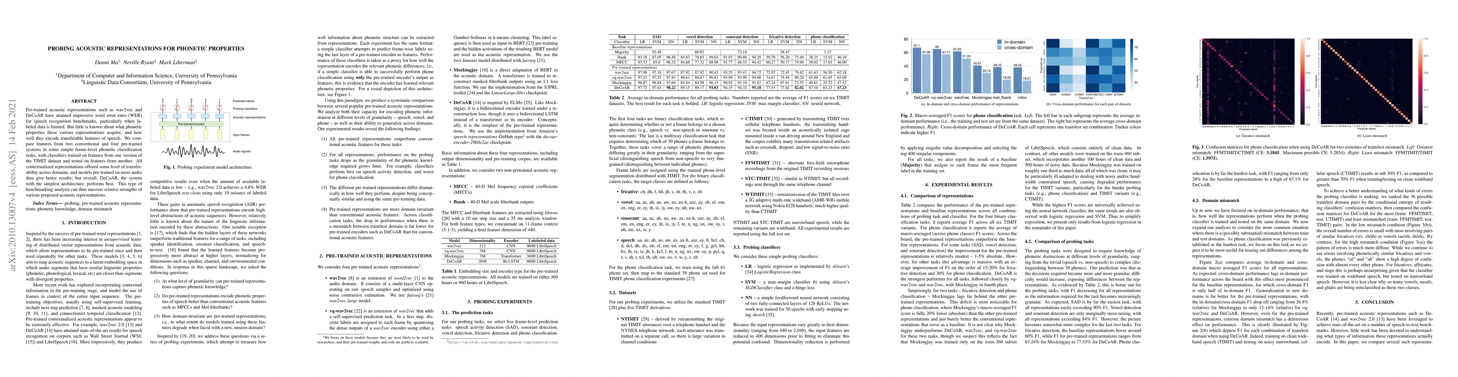 This paper evaluates the phonetic properties and transferability of various acoustic representations, including wav2vec and DeCoAR, through frame-level phonetic classification tasks. DeCoAR, despite its simpler architecture, outperforms other models in transferring features across different datasets, indicating its relative strengths in acoustic representation.