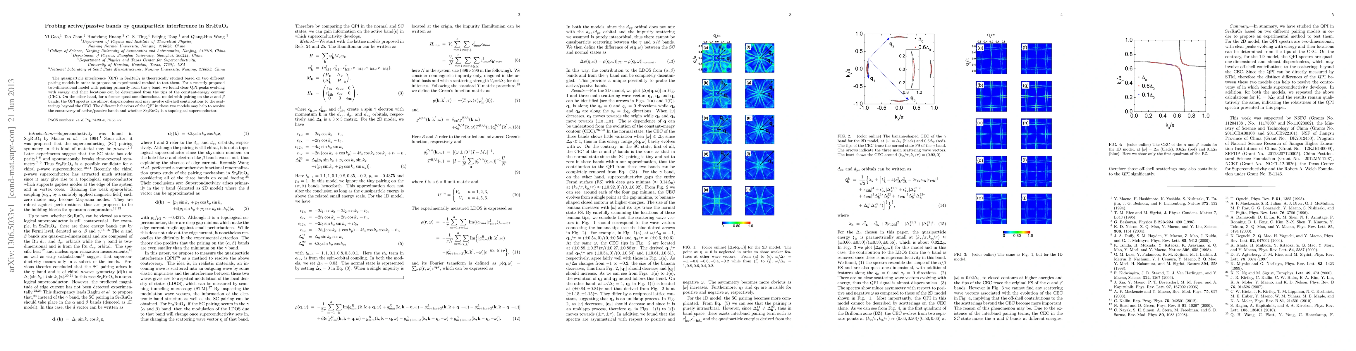 The paper presents a detailed theoretical analysis of quasiparticle interference in Sr2RuO4 under two different pairing models, demonstrating distinct QPI behaviors that could differentiate between active/passive bands.