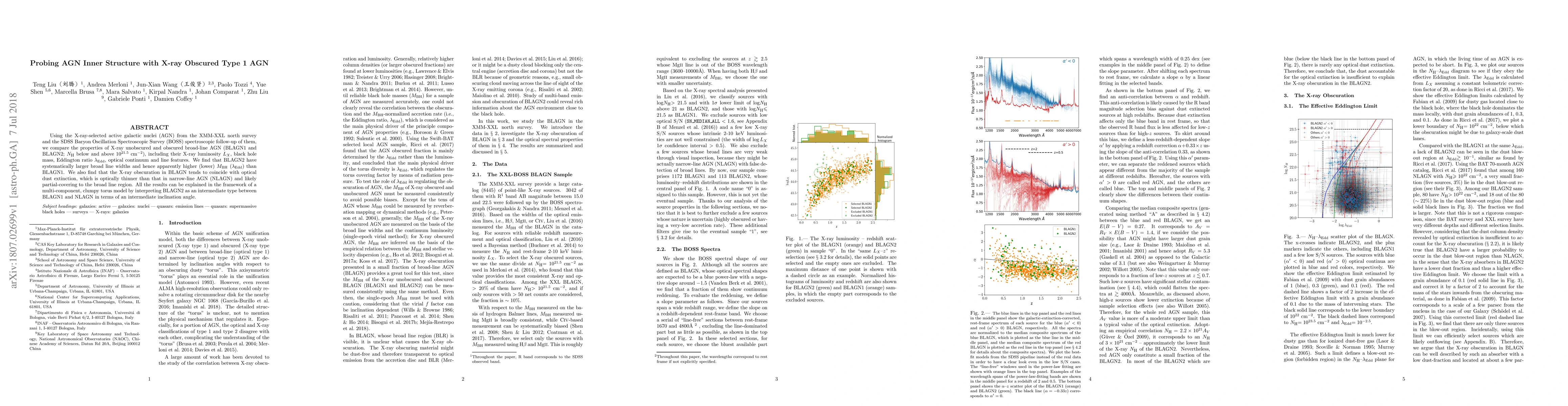 Using the X-ray-selected active galactic nuclei (AGN) from the XMM-XXL north survey and the SDSS Baryon Oscillation Spectroscopic Survey (BOSS) spectroscopic follow-up of them, we compare the properties of X-ray unobscured and obscured broad-line AGN (BLAGN1 and BLAGN2; $N_\textrm{H}$below and above $10^{21.5}$ cm$^{-2}$), including their X-ray luminosity $L_X$, black hole mass, Eddington ratio $\lambda_{\textrm{Edd}}$, optical continuum and line features. We find that BLAGN2 have systematically larger broad line widths and hence apparently higher (lower) $M_{\textrm{BH}}$ ($\lambda_{\textrm{Edd}}$) than BLAGN1. We also find that the X-ray obscuration in BLAGN tends to coincide with optical dust extinction, which is optically thinner than that in narrow-line AGN (NLAGN) and likely partial-covering to the broad line region. All the results can be explained in the framework of a multi-component, clumpy torus model by interpreting BLAGN2 as an intermediate type between BLAGN1 and NLAGN in terms of an intermediate inclination angle.