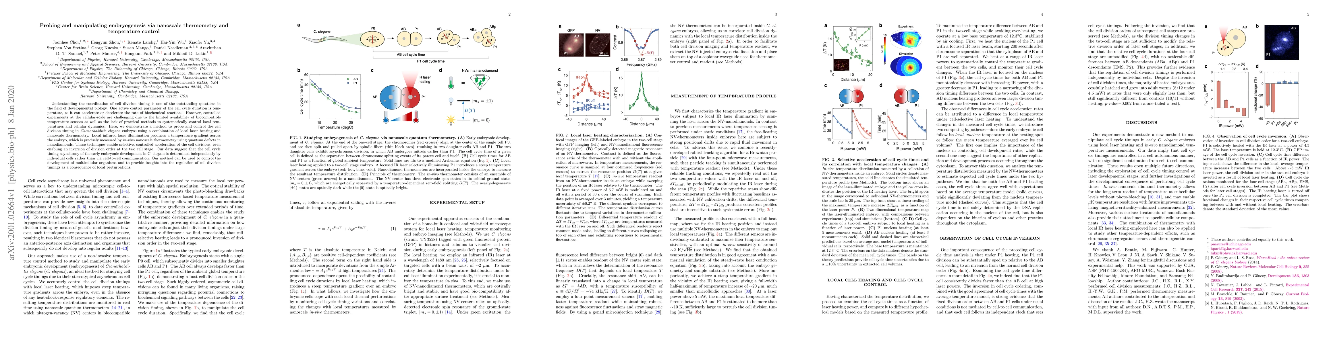 This paper presents a method combining local laser heating and nanoscale thermometry using nanodiamonds to probe and manipulate cell division timing in C. elegans embryos, revealing that individual cells regulate their own division timing independently. The technique allows for precise control over cell cycle durations and division order.