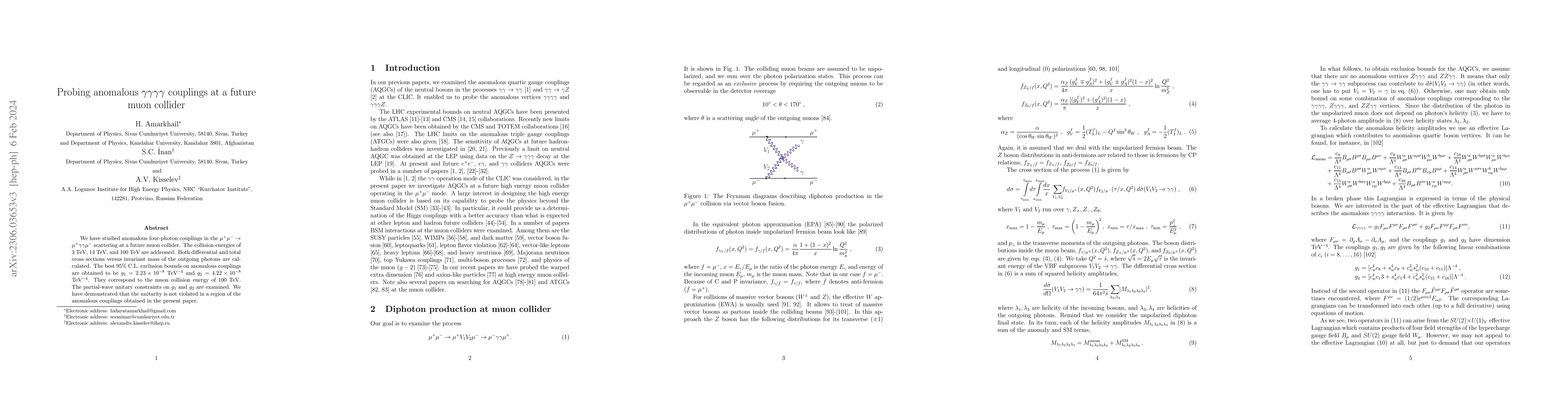 This paper investigates anomalous four-photon couplings in muon scattering at future muon colliders with energies up to 100 TeV, finding best exclusion bounds of $g_1 = 2.23 \times 10^{-8}$ TeV$^{-4}$ and $g_2 = 4.22 \times 10^{-8}$ TeV$^{-4}$ while confirming that unitarity constraints are not violated.