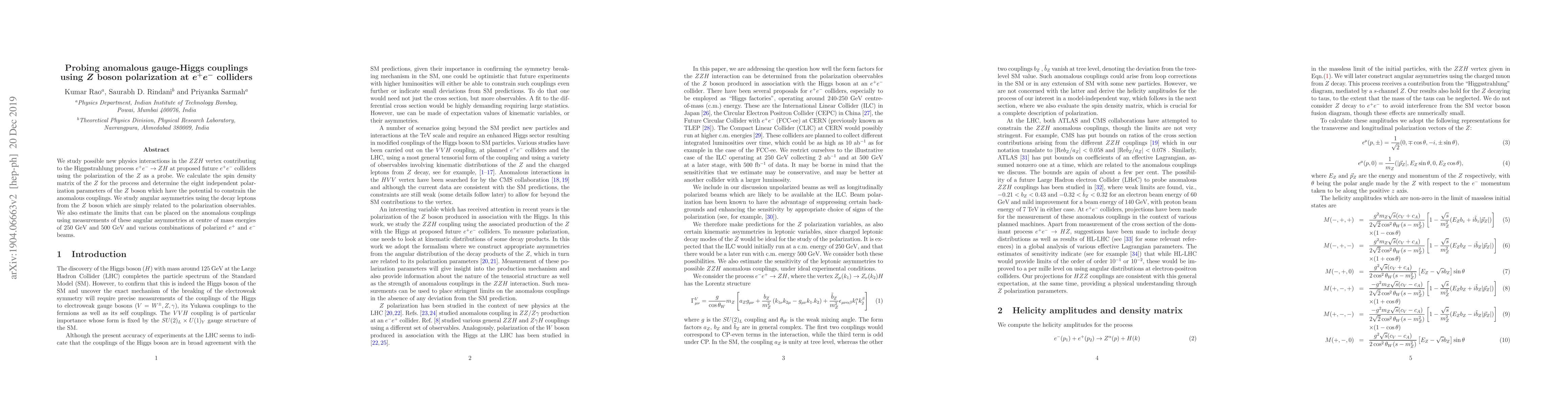This paper investigates new physics interactions at the $ZZH$ vertex through the polarization of the $Z$ boson in the Higgsstrahlung process $e^+ e^- \to ZH$ at future colliders. It calculates polarization parameters and angular asymmetries to constrain anomalous gauge-Higgs couplings, estimating limits at 250 GeV and 500 GeV energies.