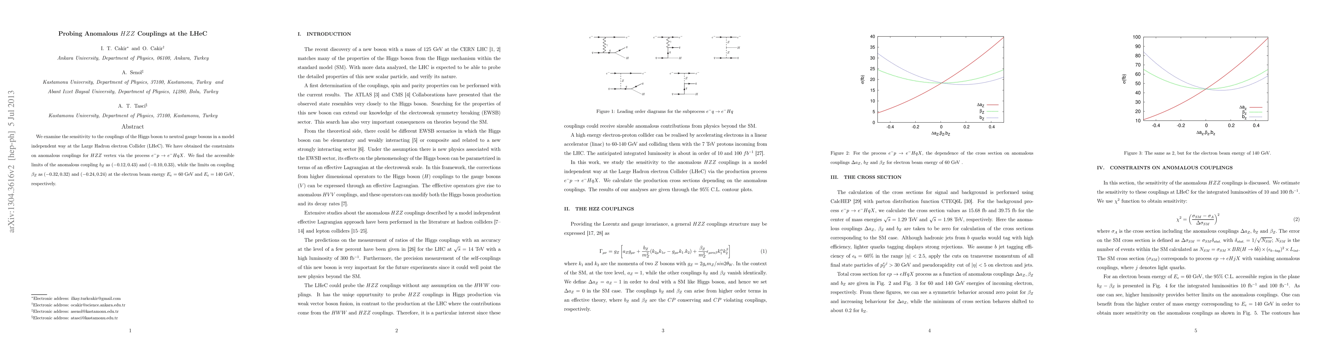 We examine the sensitivity to the couplings of the Higgs boson to neutral gauge bosons in a model independent way at the Large Hadron electron Collider (LHeC). We have obtained the constraints on anomalous couplings for $HZZ$ vertex via the process $e^{-}p\rightarrow e^{-}HqX$. We find the accessible limits of the anomalous coupling $b_{Z}$ as $(-0.12,0.43)$ and $(-0.10,0.33)$, while the limits on coupling $\beta_{Z}$ as ($-0.32,0.32$) and $(-0.24,0.24)$ at the electron beam energy $E_{e}=60$ GeV and $E_{e}=140$ GeV, respectively.