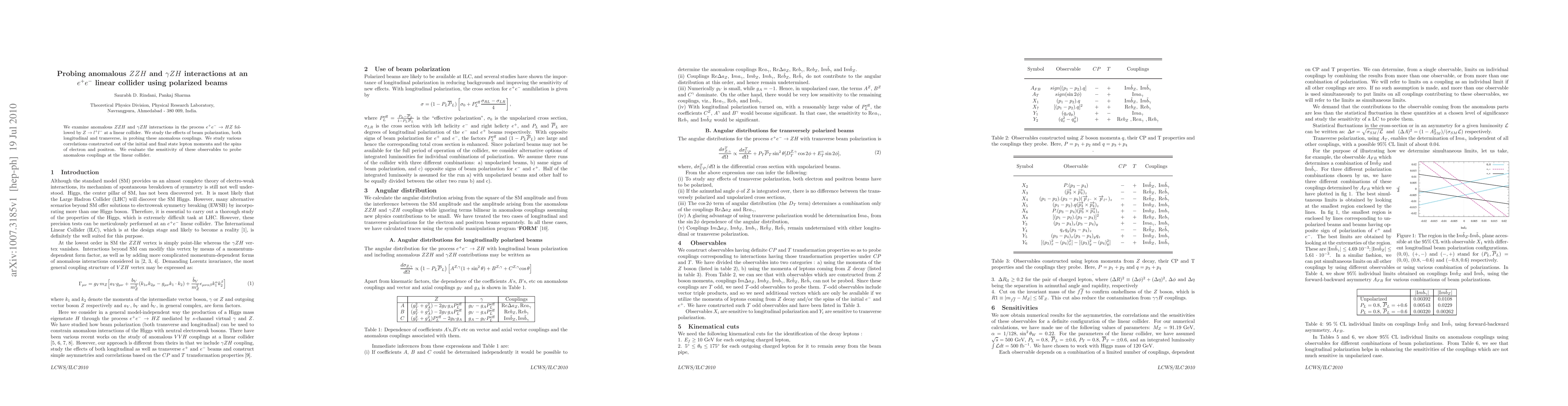 We examine anomalous ZZH and gammaZH interactions in the process e+e- -> HZ followed by Z -> l+l- at a linear collider. We study the effects of beam polarization, both longitudinal and transverse, in probing these anomalous couplings. We study various correlations constructed out of the initial and final state lepton momenta and the spins of electron and positron. We evaluate the sensitivity of these observables to probe anomalous couplings at the linear collider.