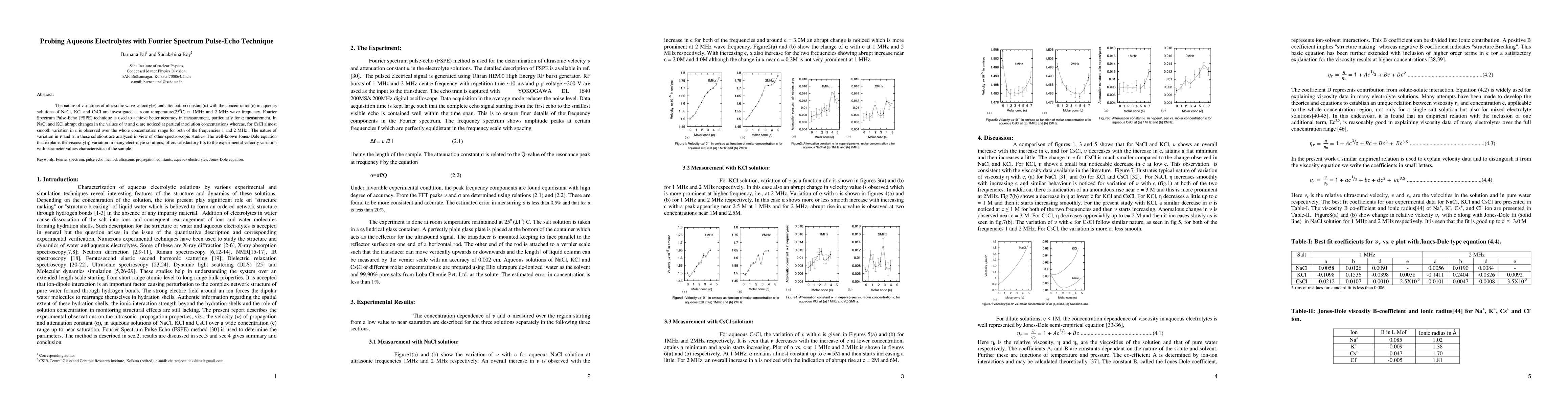 The nature of variations of ultrasonic wave velocity(v) and attenuation constant({\alpha}) with the concentration(c) in aqueous solutions of NaCl, KCl and CsCl are investigated at room temperature(250C) at 1MHz and 2 MHz wave frequency. Fourier Spectrum Pulse-Echo (FSPE) technique is used to achieve better accuracy in measurement, particularly for {\alpha} measurement. In NaCl and KCl abrupt changes in the values of v and {\alpha} are noticed at particular solution concentrations whereas, for CsCl almost smooth variation in v is observed over the whole concentration range for both of the frequencies 1 and 2 MHz . The nature of variation in v and {\alpha} in these solutions are analyzed in view of other spectroscopic studies. The well-known Jones-Dole equation that explains the viscosity({\eta}) variation in many electrolyte solutions, offers satisfactory fits to the experimental velocity variation with parameter values characteristics of the sample.