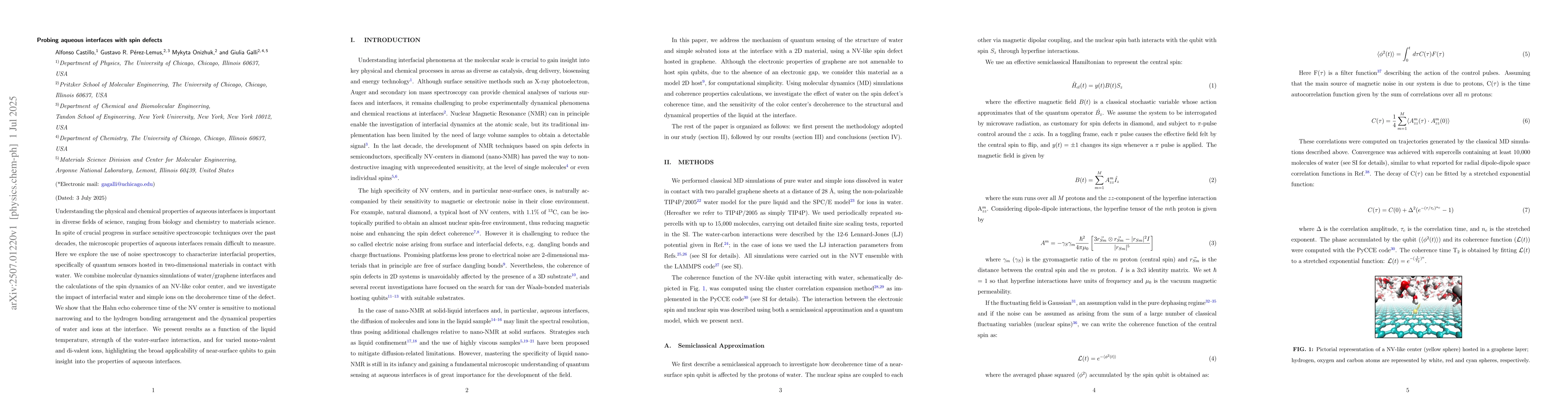 Understanding the physical and chemical properties of aqueous interfaces is important in diverse fields of science, ranging from biology and chemistry to materials science. In spite of crucial progress in surface sensitive spectroscopic techniques over the past decades, the microscopic properties of aqueous interfaces remain difficult to measure. Here we explore the use of noise spectroscopy to characterize interfacial properties, specifically of quantum sensors hosted in two-dimensional materials in contact with water. We combine molecular dynamics simulations of water/graphene interfaces and the calculations of the spin dynamics of an NV-like color center, and we investigate the impact of interfacial water and simple ions on the decoherence time of the defect. We show that the Hahn echo coherence time of the NV center is sensitive to motional narrowing and to the hydrogen bonding arrangement and the dynamical properties of water and ions at the interface. We present results as a function of the liquid temperature, strength of the water-surface interaction, and for varied mono-valent and di-valent ions, highlighting the broad applicability of near-surface qubits to gain insight into the properties of aqueous interfaces.