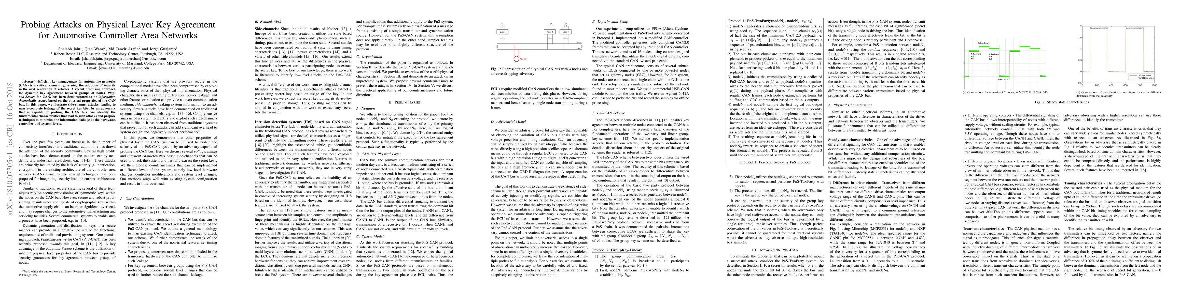 Efficient key management for automotive networks (CAN) is a critical element, governing the adoption of security in the next generation of vehicles. A recent promising approach for dynamic key agreement between groups of nodes, Plug-and-Secure for CAN, has been demonstrated to be information theoretically secure based on the physical properties of the CAN bus. In this paper, we illustrate side-channel attacks, leading to nearly-complete leakage of the secret key bits, by an adversary that is capable of probing the CAN bus. We identify the fundamental characteristics that lead to such attacks and propose techniques to minimize the information leakage at the hardware, controller and system levels.