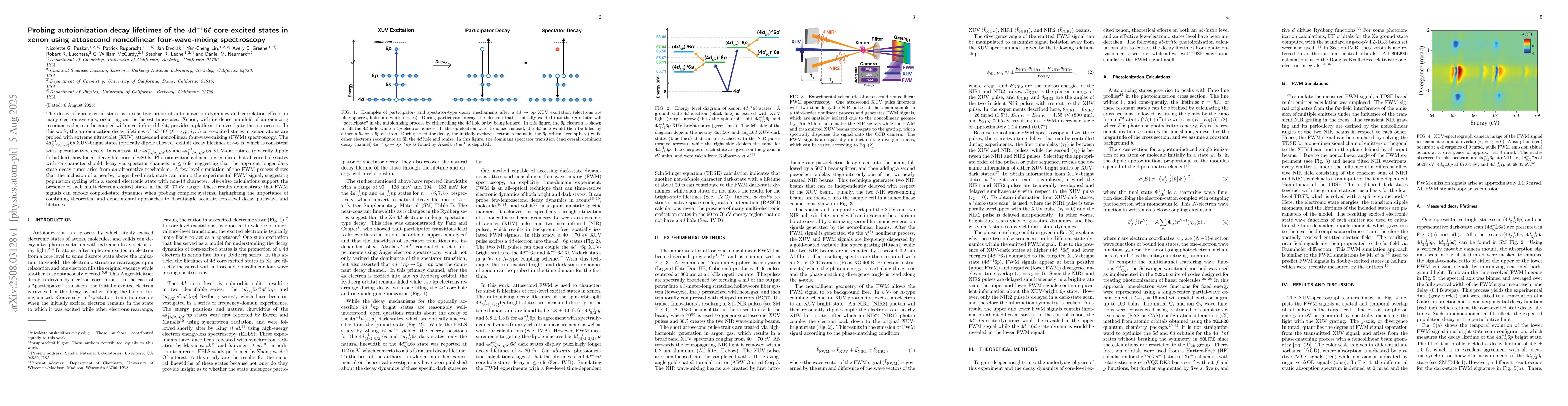 The decay of core-excited states is a sensitive probe of autoionization dynamics and correlation effects in many-electron systems, occurring on the fastest timescales. Xenon, with its dense manifold of autoionizing resonances that can be coupled with near-infrared light, provides a platform to investigate these processes. In this work, the autoionization decay lifetimes of $4d^{-1}6\ell$ $(\ell = s, p, d, ...)$ core-excited states in xenon atoms are probed with extreme ultraviolet (XUV) attosecond noncollinear four-wave-mixing (FWM) spectroscopy. The $4d^{-1}_{\{5/2,\, 3/2\}}6p$ XUV-bright states (optically dipole allowed) exhibit decay lifetimes of $\sim$6 fs, which is consistent with spectator-type decay. In contrast, the $4d^{-1}_{\{5/2,\, 3/2\}}6s$ and $4d^{-1}_{\{5/2,\, 3/2\}}6d$ XUV-dark states (optically dipole forbidden) show longer decay lifetimes of $\sim$20 fs. Photoionization calculations confirm that all core-hole states with $4d$ character should decay via spectator channels in $\leq$ 6 fs, suggesting that the apparent longer dark state decay times arise from an alternative mechanism. A few-level simulation of the FWM process shows that the inclusion of a nearby, longer-lived dark state can mimic the experimental FWM signal, suggesting population cycling with a second electronic state with non-$4d$ character. Ab-initio calculations support the presence of such multi-electron excited states in the 60$-$70 eV range. These results demonstrate that FWM signals can encode coupled-state dynamics when probing complex systems, highlighting the importance of combining theoretical and experimental approaches to disentangle accurate core-level decay pathways and lifetimes.