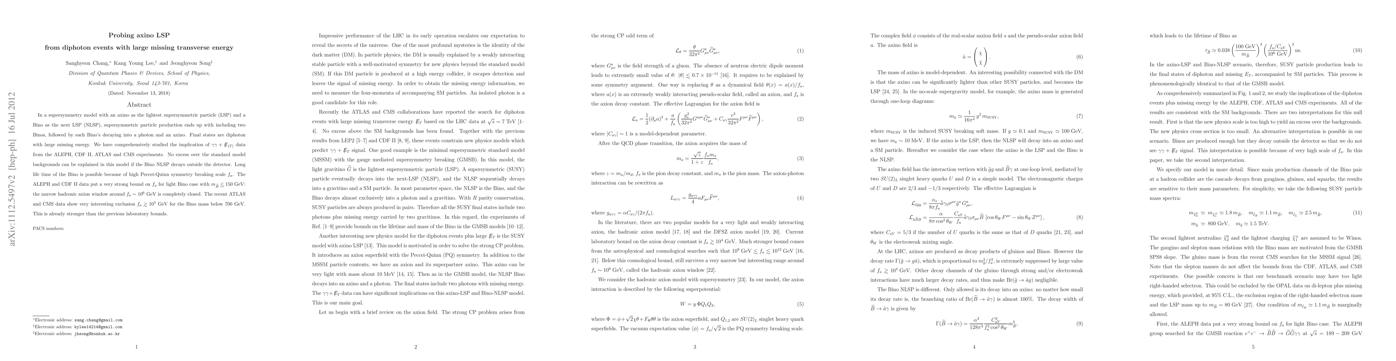 In a supersymmetry model with an axino as the lightest supersymmetric particle (LSP) and a Bino as the next LSP (NLSP), supersymmetry particles produced in pair at a high energy collider end up with including two Binos, followed by each Bino's decay into a photon and an axino. Final states are diphoton with large missing energy. We have comprehensively studied the implication of $\gamma\gamma+$MET data from the ALEPH, CDF II, and recent ATLAS and CMS experiments. No excess over the standard model backgrounds can be explained in this model if the NLSP Bino decays outside the detector, which happens when the axino decay constant $f_a$ is large enough. The ALEPH and CDF II data put a very strong bound on $f_a$ for light Bino case with $m_{\tilde{B}} < 150$ GeV: the narrow hadronic axion window around $f_a \sim 10^6$ GeV is completely closed. In the case where the gluino mass is smaller than about 776 GeV, the recent ATLAS data limit $f_a > 10^5$ GeV for the Bino mass below 700 GeV. This is already stronger than the previous laboratory bounds.