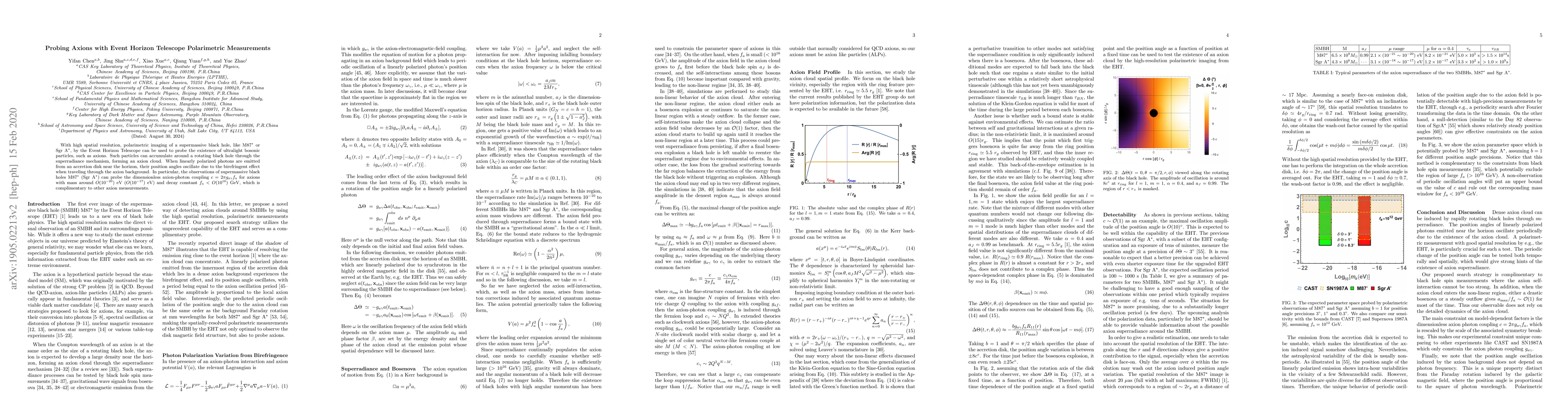 This paper explores using the Event Horizon Telescope's polarimetric imaging to detect axions, ultralight bosonic particles, by observing the birefringent effect on linearly polarized photons emitted near supermassive black holes like M87$^\star$ and Sgr A$^\star$. The study aims to probe axion-photon coupling for axions with specific mass and decay constant values, complementing other axion detection methods.