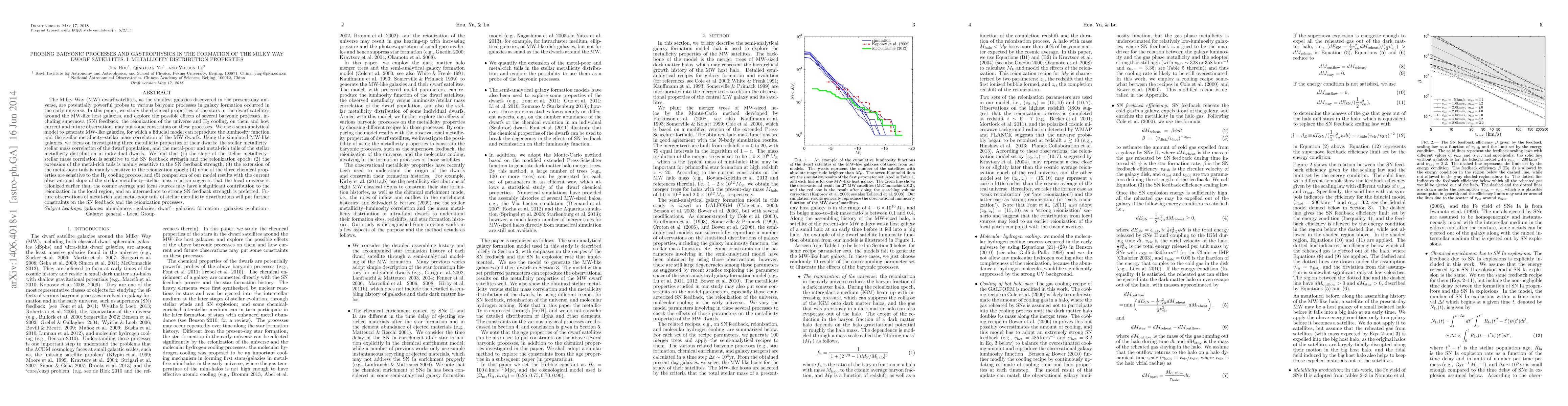 In this paper, we study the chemical properties of the stars in the dwarf satellites around the MW-like host galaxies, and explore the possible effects of several baryonic processes, including supernova (SN) feedback, the reionization of the universe and H$_2$ cooling, on them and how current and future observations may put some constraints on these processes. We use a semi-analytical model to generate MW-like galaxies, for which a fiducial model can reproduce the luminosity function and the stellar metallicity--stellar mass correlation of the MW dwarfs. Using the simulated MW-like galaxies, we focus on investigating three metallicity properties of their dwarfs: the stellar metallicity--stellar mass correlation of the dwarf population, and the metal-poor and metal-rich tails of the stellar metallicity distribution in individual dwarfs. We find that (1) the slope of the stellar metallicity--stellar mass correlation is sensitive to the SN feedback strength and the reionization epoch; (2) the extension of the metal-rich tails is mainly sensitive to the SN feedback strength; (3) the extension of the metal-poor tails is mainly sensitive to the reionization epoch; (4) none of the three chemical properties are sensitive to the H$_2$ cooling process; and (5) comparison of our model results with the current observational slope of the stellar metallicity--stellar mass relation suggests that the local universe is reionized earlier than the cosmic average and local sources may have a significant contribution to the reionization in the local region, and an intermediate to strong SN feedback strength is preferred. Future observations of metal-rich and metal-poor tails of stellar metallicity distributions will put further constraints on the SN feedback and the reionization processes.