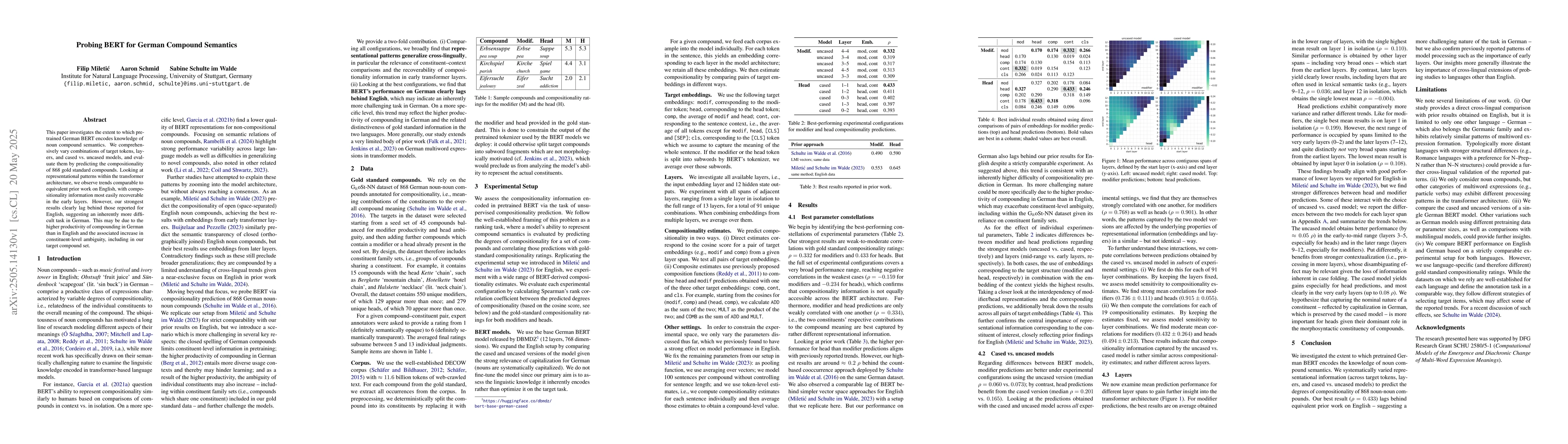 The paper presents a comprehensive analysis of German BERT's encoding of noun compound semantics, identifying trends comparable to English yet highlighting the unique challenges posed by German compounding.