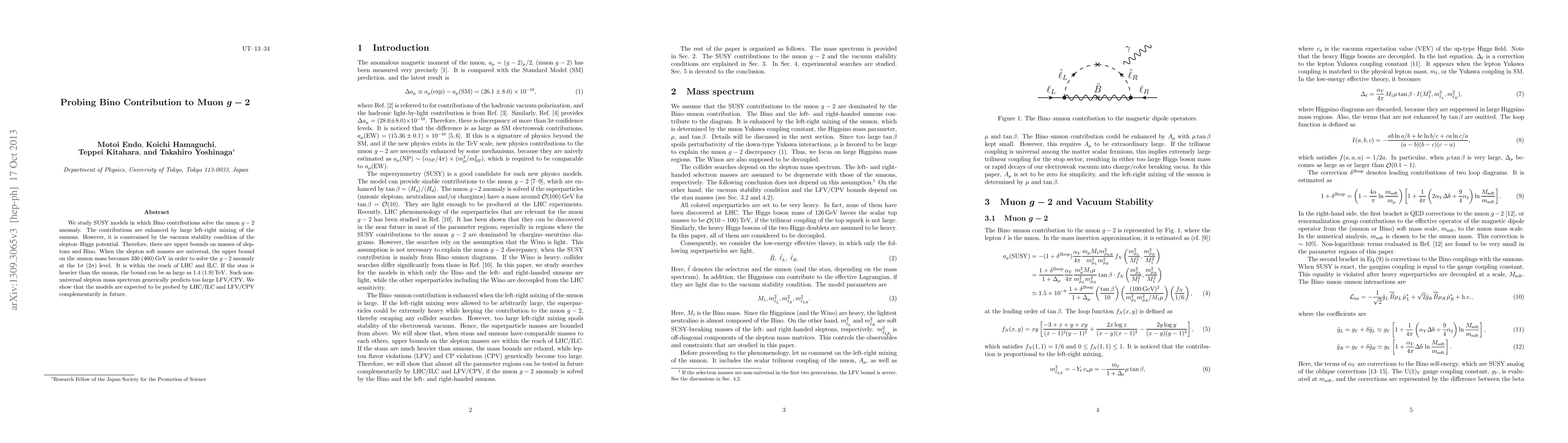 We study SUSY models in which Bino contributions solve the muon g-2 anomaly. The contributions are enhanced by large left-right mixing of the smuons. However, it is constrained by the vacuum stability condition of the slepton--Higgs potential. Therefore, there are upper bounds on masses of sleptons and Bino. When the slepton soft masses are universal, the upper bound on the smuon mass becomes 330 (460)GeV in order to solve the g-2 anomaly at the 1 sigma (2 sigma) level. It is within the reach of LHC and ILC. If the stau is heavier than the smuon, the bound can be as large as 1.4 (1.9)TeV. Such non-universal slepton mass spectrum generically predicts too large LFV/CPV. We show that the models are expected to be probed by LHC/ILC and LFV/CPV complementarily in future.
