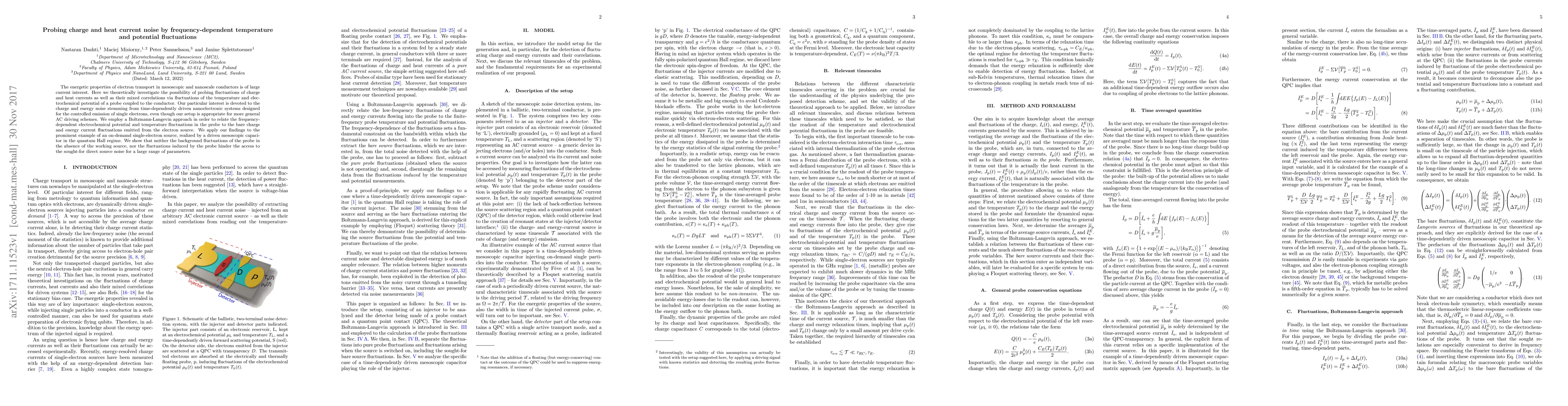 This paper theoretically investigates how fluctuations in temperature and electrochemical potential of a probe can reveal charge and heat current noise in mesoscopic conductors, employing a Boltzmann-Langevin approach. It demonstrates that these fluctuations can be used to probe the intrinsic noise from single-electron sources, even in time-dependently driven nanoelectronic systems.