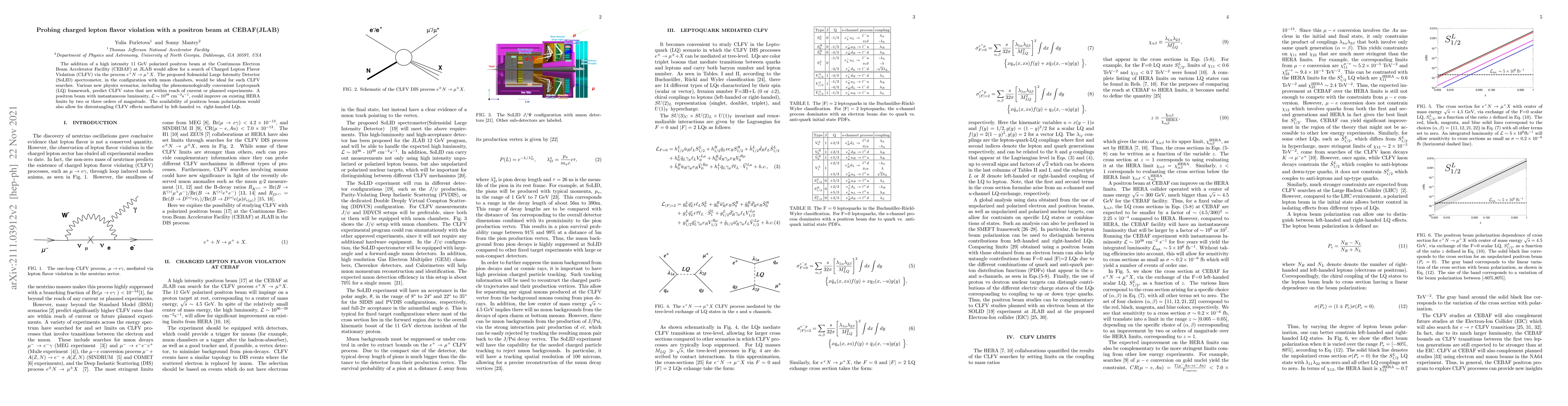 The addition of a high intensity 11 GeV polarized positron beam at the Continuous Electron Beam Accelerator Facility (CEBAF) at JLAB would allow for a search of Charged Lepton Flavor Violation (CLFV) via the process $e^+N \rightarrow \mu^+ X$. The proposed Solenoidal Large Intensity Detector (SoLID) spectrometer, in the configuration with muon chambers, would be ideal for such CLFV searches. Various new physics scenarios, including the phenomenologically convenient Leptoquark (LQ) framework, predict CLFV rates that are within reach of current or planned experiments. A positron beam with instantaneous luminosity, ${\cal L}\sim 10^{38}$ cm$^{-2}$s$^{-1}$, could improve on existing HERA limits by two or three orders of magnitude. The availability of positron beam polarization would also allow for distentangling CLFV effects mediated by left-handed vs. right-handed LQs.