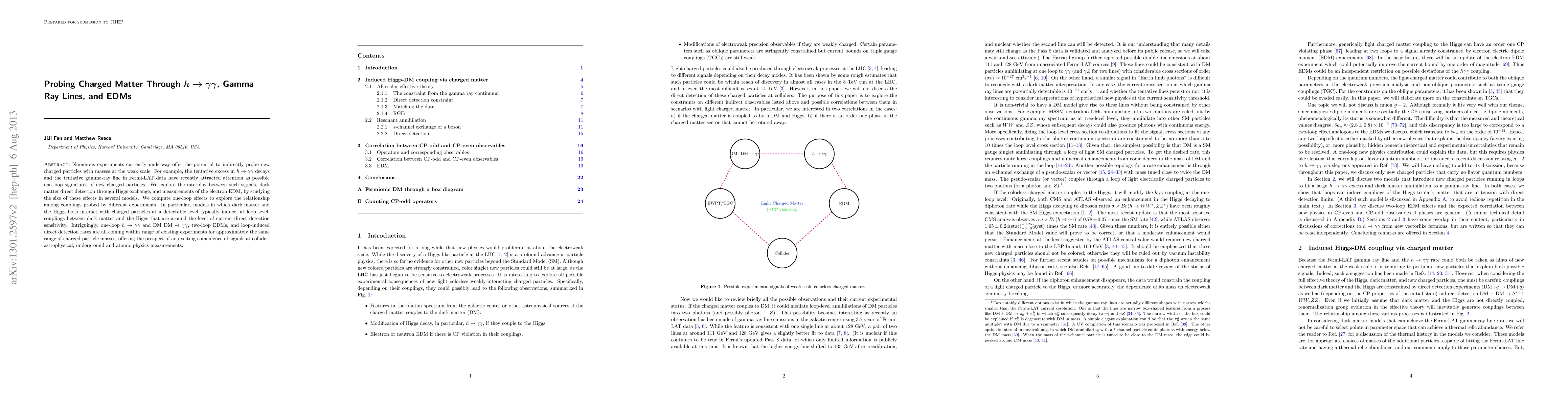Numerous experiments currently underway offer the potential to indirectly probe new charged particles with masses at the weak scale. For example, the tentative excess in Higgs diphoton decay and the tentative gamma-ray line in Fermi-LAT data have recently attracted attention as possible one-loop signatures of new charged particles. We explore the interplay between such signals, dark matter direct detection through Higgs exchange, and measurements of the electron EDM, by studying the size of these effects in several models. We compute one-loop effects to explore the relationship among couplings probed by different experiments. In particular, models in which dark matter and the Higgs both interact with charged particles at a detectable level typically induce, at loop level, couplings between dark matter and the Higgs that are around the level of current direct detection sensitivity. Intriguingly, one-loop Higgs diphoton decay and DM annihilation into two photons, two-loop EDMs, and loop-induced direct detection rates are all coming within range of existing experiments for approximately the same range of charged particle masses, offering the prospect of an exciting coincidence of signals at collider, astrophysical, underground and atomic physics measurements.