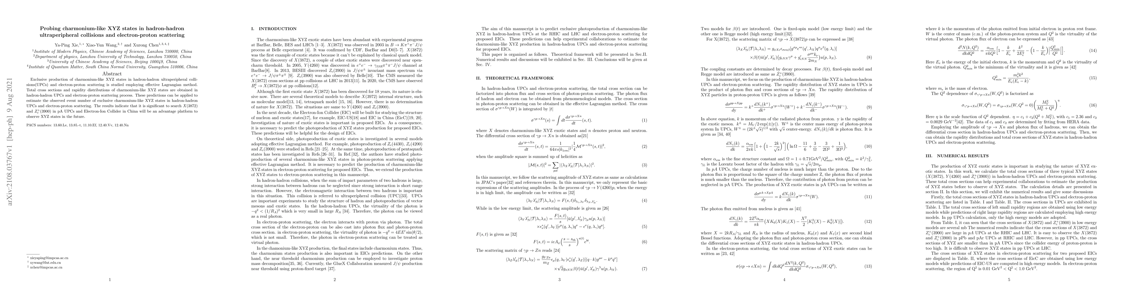 This paper investigates the production of charmonium-like XYZ states via ultraperipheral hadron-hadron collisions and electron-proton scattering using an effective Lagrangian method. Predictions for total cross sections and rapidity distributions suggest significant potential for observing $X(3872)$ and $Z^+_c(3900)$ in future experiments at the Electron-Ion Collider in China.