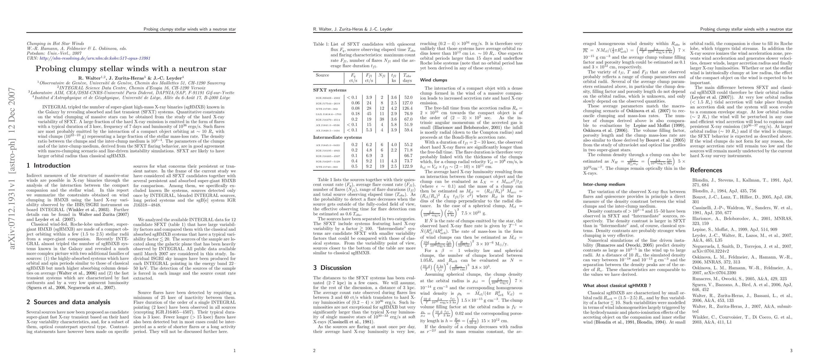 INTEGRAL tripled the number of super-giant high-mass X-ray binaries (sgHMXB) known in the Galaxy by revealing absorbed and fast transient (SFXT) systems. Quantitative constraints on the wind clumping of massive stars can be obtained from the study of the hard X-ray variability of SFXT. A large fraction of the hard X-ray emission is emitted in the form of flares with a typical duration of 3 ksec, frequency of 7 days and luminosity of 1E36 ergs/s. Such flares are most probably emitted by the interaction of a compact object orbiting at ~ 10 R* with wind clumps (1E(22-23) g) representing a large fraction of the stellar mass-loss rate. The density ratio between the clumps and the inter-clump medium is 1E(2-4) . The parameters of the clumps and of the inter-clump medium, derived from the SFXT flaring behavior, are in good agreement with macro-clumping scenario and line-driven instability simulations. SFXT are likely to have larger orbital radius than classical sgHMXB.