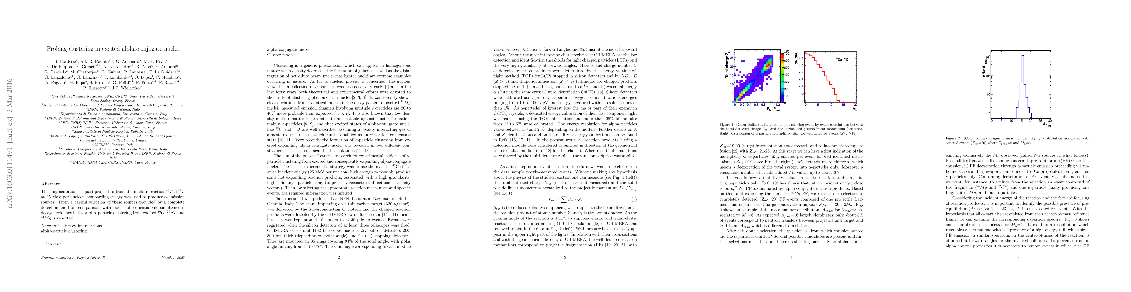 The fragmentation of quasi-projectiles from the nuclear reaction $^{40}$Ca+$^{12}$C at 25 MeV per nucleon bombarding energy was used to produce $\alpha$-emission sources. From a careful selection of these sources provided by a complete detection and from comparisons with models of sequential and simultaneous decays, evidence in favor of $\alpha$-particle clustering from excited $^{16}O$, $^{20}Ne$ and $^{24}Mg$ is reported.