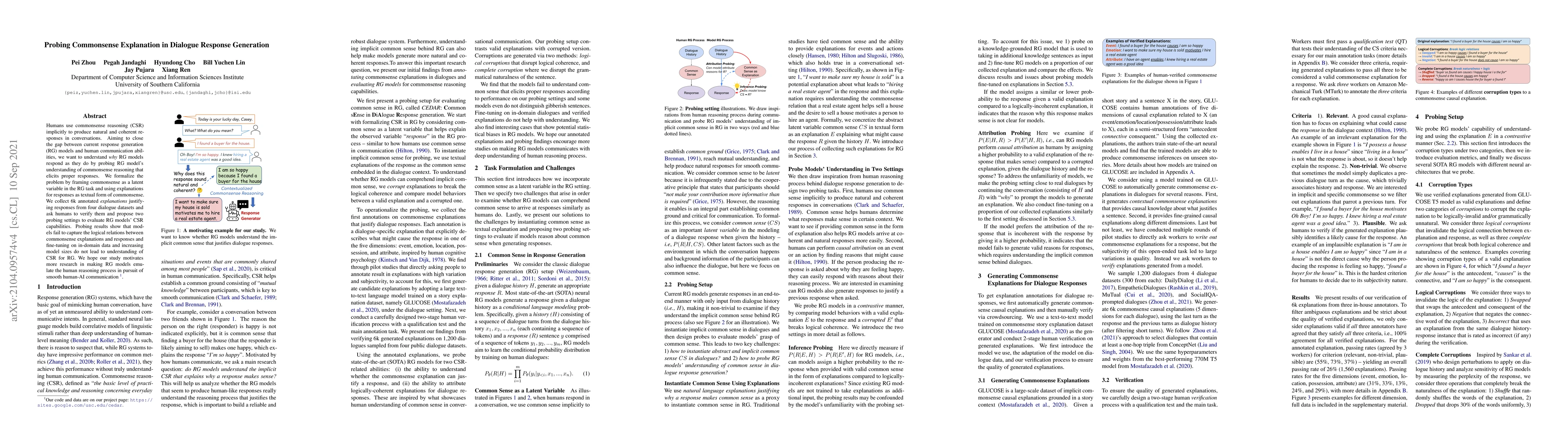 Humans use commonsense reasoning (CSR) implicitly to produce natural and coherent responses in conversations. Aiming to close the gap between current response generation (RG) models and human communication abilities, we want to understand why RG models respond as they do by probing RG model's understanding of commonsense reasoning that elicits proper responses. We formalize the problem by framing commonsense as a latent variable in the RG task and using explanations for responses as textual form of commonsense. We collect 6k annotated explanations justifying responses from four dialogue datasets and ask humans to verify them and propose two probing settings to evaluate RG models' CSR capabilities. Probing results show that models fail to capture the logical relations between commonsense explanations and responses and fine-tuning on in-domain data and increasing model sizes do not lead to understanding of CSR for RG. We hope our study motivates more research in making RG models emulate the human reasoning process in pursuit of smooth human-AI communication.