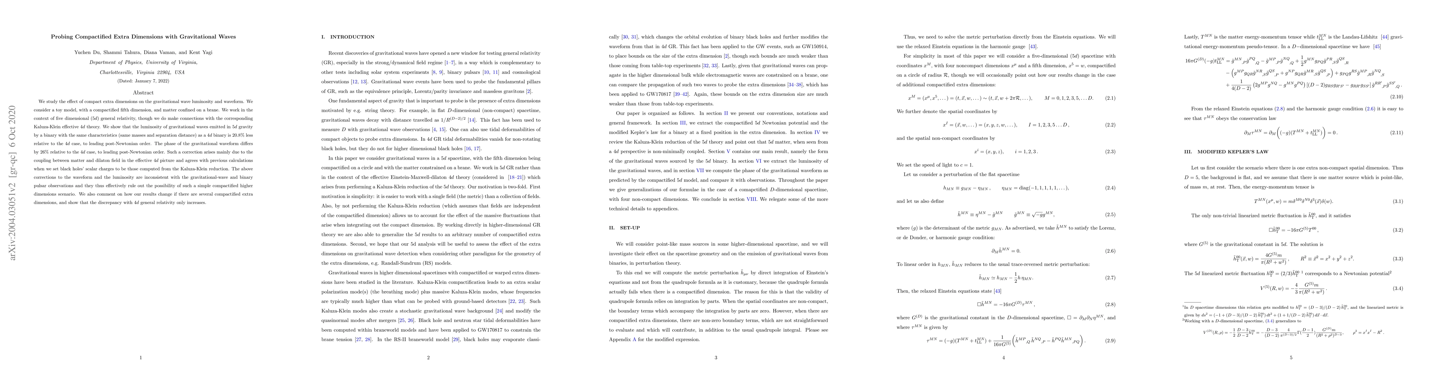 This paper investigates the impact of compact extra dimensions on gravitational wave luminosity and waveform in a $5d$ general relativity framework, finding a 20.8% reduction in luminosity and a 26% phase difference compared to $4d$ scenarios. These discrepancies rule out simple compactified higher dimension models, as they conflict with current gravitational wave and binary pulsar observations.