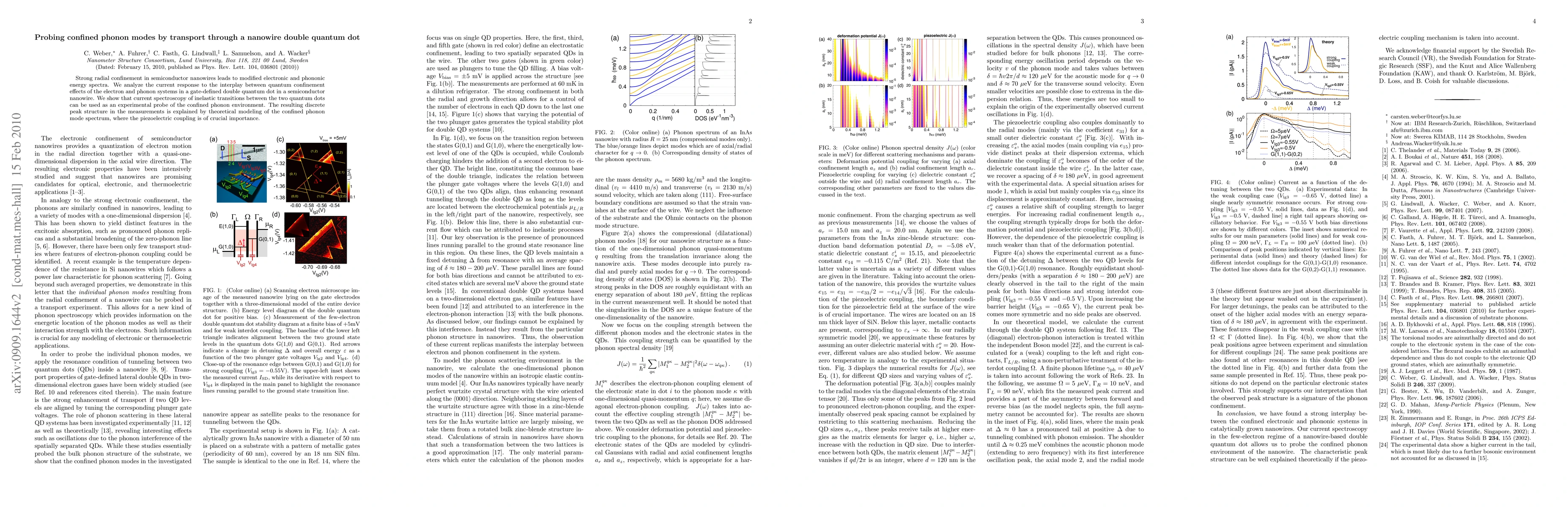 This paper investigates how transport through a double quantum dot in a semiconductor nanowire can reveal confined phonon modes. The study demonstrates that current spectroscopy can serve as an experimental probe of these phonon modes, with theoretical modeling highlighting the role of piezoelectric coupling in the observed discrete peak structure.