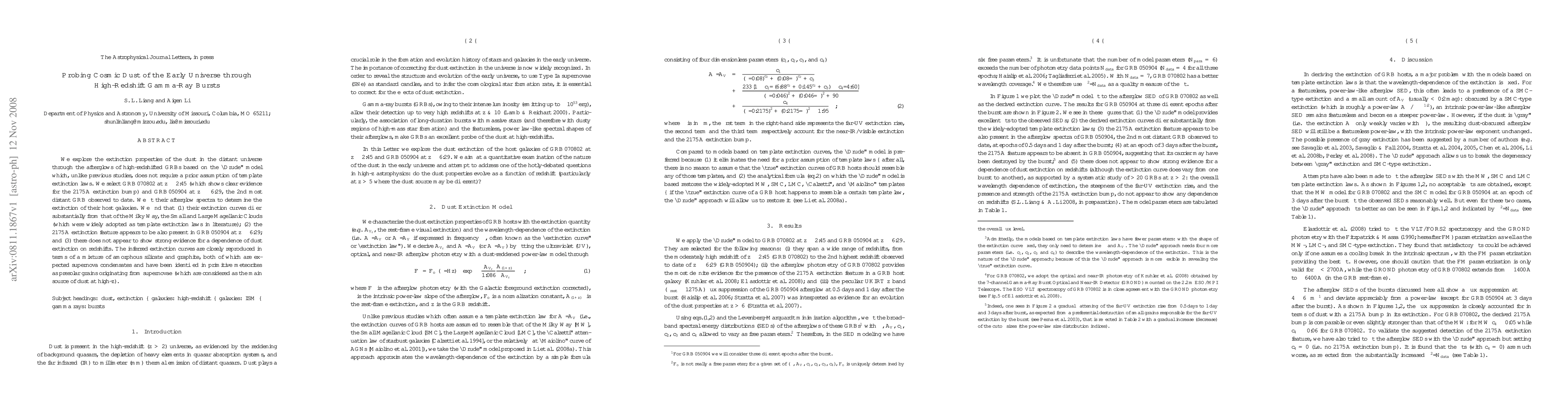 We explore the extinction properties of the dust in the distant universe through the afterglows of high-redshifted GRBs based on the "Drude" model which, unlike previous studies, does not require a prior assumption of template extinction laws. We select GRB070802 at z~2.45 (which shows clear evidence for the 2175\AA extinction bump) and GRB050904 at z~6.29, the 2nd most distant GRB observed to date. We fit their afterglow spectra to determine the extinction of their host galaxies. We find that (1) their extinction curves differ substantially from that of the Milky Way, the Small and Large Magellanic Clouds (which were widely adopted as template extinction laws in literature); (2) the 2175\AA extinction feature appears to be also present in GRB050904 at z~6.29; and (3) there does not appear to show strong evidence for a dependence of dust extinction on redshifts. The inferred extinction curves are closely reproduced in terms of a mixture of amorphous silicate and graphite, both of which are expected supernova condensates and have been identified in primitive meteorites as presolar grains originating from supernovae (which are considered as the main source of dust at high-z).