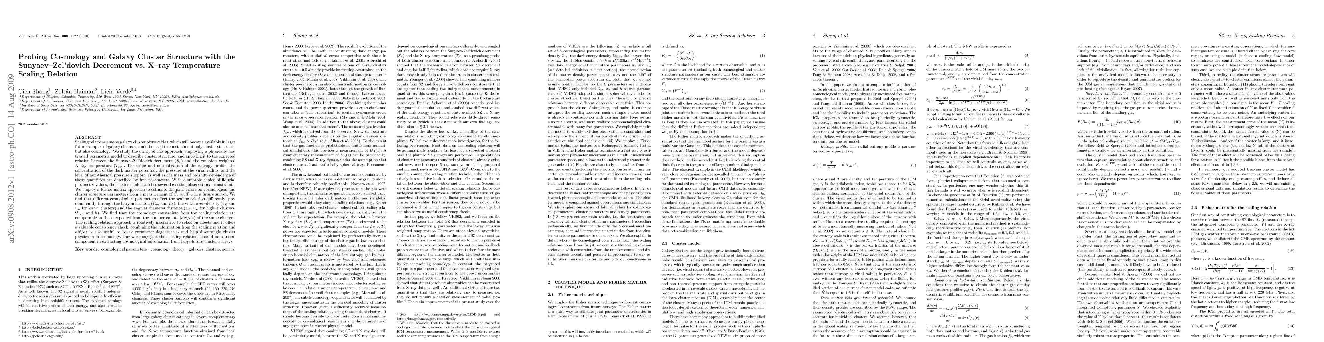 Scaling relations among galaxy cluster observables, which will become available in large future samples of galaxy clusters, could be used to constrain not only cluster structure, but also cosmology. We study the utility of this approach, employing a physically motivated parametric model to describe cluster structure, and applying it to the expected relation between the Sunyaev-Zel'dovich decrement (S_\nu) and the emission-weighted X-ray temperature (T_ew). The slope and normalization of the entropy profile, the concentration of the dark matter potential, the pressure at the virial radius, and the level of non-thermal pressure support, as well as the mass and redshift-dependence of these quantities are described by free parameters. With a suitable choice of fiducial parameter values, the cluster model satisfies several existing observational constraints. We employ a Fisher matrix approach to estimate the joint errors on cosmological and cluster structure parameters from a measurement of S_\nu vs. T_ew in a future survey. We find that different cosmological parameters affect the scaling relation differently: predominantly through the baryon fraction (\Omega_m and \Omega_b), the virial overdensity (w_0 and w_a for low-z clusters) and the angular diameter distance (w_0, w_a for high-z clusters; \Omega_DE and h). We find that the cosmology constraints from the scaling relation are comparable to those expected from the number counts (dN/dz) of the same clusters. The scaling relation approach is relatively insensitive to selection effects and it offers a valuable consistency check; combining the information from the scaling relation and dN/dz is also useful to break parameter degeneracies and help disentangle cluster physics from cosmology.