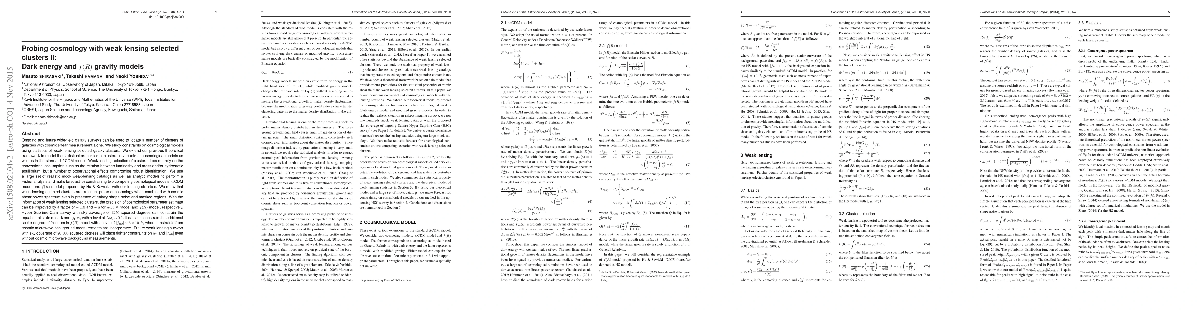 Ongoing and future wide-field galaxy surveys can be used to locate a number of clusters of galaxies with cosmic shear measurement alone. We study constraints on cosmological models using statistics of weak lensing selected galaxy clusters. We extend our previous theoretical framework to model the statistical properties of clusters in variants of cosmological models as well as in the standard $\Lambda$CDM model. Weak lensing selection of clusters does not rely on the conventional assumption such as the relation between luminosity and mass and/or hydrostatic equilibrium, but a number of observational effects compromise robust identification. We use a large set of realistic mock weak-lensing catalogs as well as analytic models to perform a Fisher analysis and make forecast for constraining two competing cosmological models, $w$CDM model and $f(R)$ model proposed by Hu & Sawicki, with our lensing statistics. We show that weak lensing selected clusters are excellent probe of cosmology when combined with cosmic shear power spectrum even in presence of galaxy shape noise and masked regions. With the information of weak lensing selected clusters, the precision of cosmological parameter estimate can be improved by a factor of $\sim1.6$ and $\sim8$ for $w$CDM model and $f(R)$ model, respectively. Hyper Suprime-Cam survey with sky coverage of $1250$ squared degrees can constrain the equation of state of dark energy $w_{0}$ with a level of $\Delta w_0 \sim0.1$. It can also constrain the additional scalar degree of freedom in $f(R)$ model with a level of $|f_{R0}| \sim5\times10^{-6}$, when constraints from cosmic microwave background measurements are incorporated. Future weak lensing surveys with sky coverage of $20,000$ squared degrees will place tighter constraints on $w_{0}$ and $|f_{R0}|$ even without cosmic microwave background measurements.