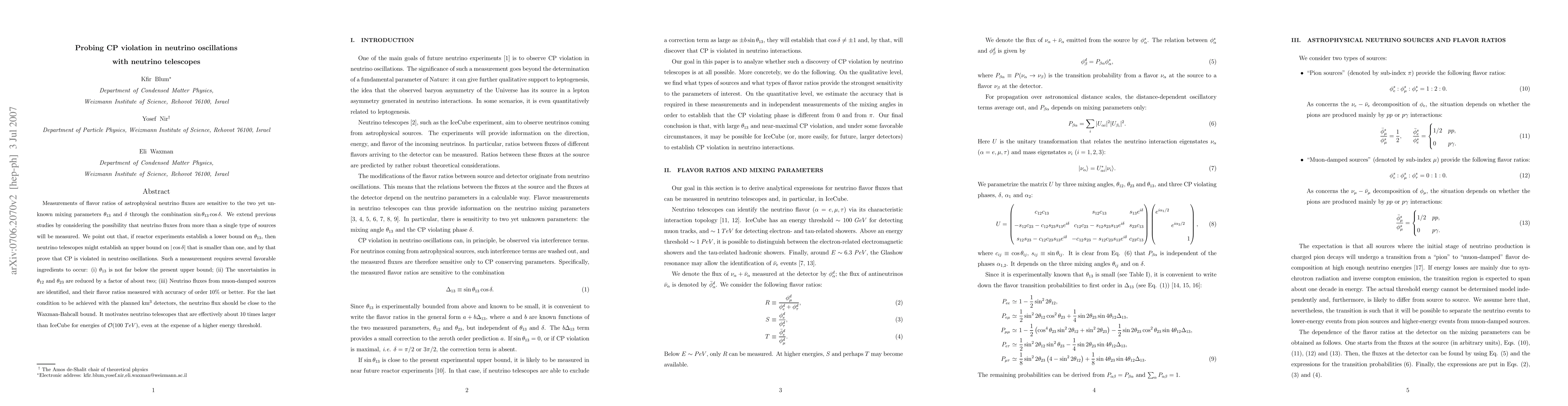 Measurements of flavor ratios of astrophysical neutrino fluxes are sensitive to the two yet unknown mixing parameters $\theta_{13}$ and $\delta$ through the combination $\sin\theta_{13}\cos\delta$. We extend previous studies by considering the possibility that neutrino fluxes from more than a single type of sources will be measured. We point out that, if reactor experiments establish a lower bound on $\theta_{13}$, then neutrino telescopes might establish an upper bound on $|\cos\delta|$ that is smaller than one, and by that prove that CP is violated in neutrino oscillations. Such a measurement requires several favorable ingredients to occur: (i) $\theta_{13}$ is not far below the present upper bound; (ii) The uncertainties in $\theta_{12}$ and $\theta_{23}$ are reduced by a factor of about two; (iii) Neutrino fluxes from muon-damped sources are identified, and their flavor ratios measured with accuracy of order 10% or better. For the last condition to be achieved with the planned km^3 detectors, the neutrino flux should be close to the Waxman-Bahcall bound. It motivates neutrino telescopes that are effectively about 10 times larger than IceCube for energies of O(100 TeV), even at the expense of a higher energy threshold.