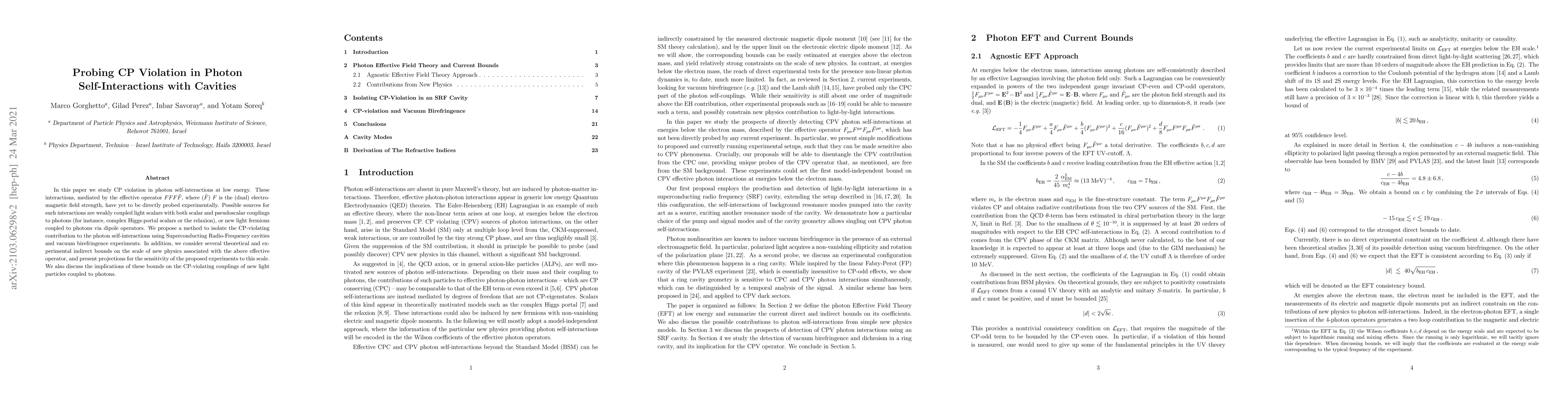In this paper we study CP violation in photon self-interactions at low energy. These interactions, mediated by the effective operator $FFF\tilde{F}$, where ($\tilde F$) $F$ is the (dual) electromagnetic field strength, have yet to be directly probed experimentally. Possible sources for such interactions are weakly coupled light scalars with both scalar and pseudoscalar couplings to photons (for instance, complex Higgs-portal scalars or the relaxion), or new light fermions coupled to photons via dipole operators. We propose a method to isolate the CP-violating contribution to the photon self-interactions using Superconducting Radio-Frequency cavities and vacuum birefringence experiments. In addition, we consider several theoretical and experimental indirect bounds on the scale of new physics associated with the above effective operator, and present projections for the sensitivity of the proposed experiments to this scale. We also discuss the implications of these bounds on the CP-violating couplings of new light particles coupled to photons.