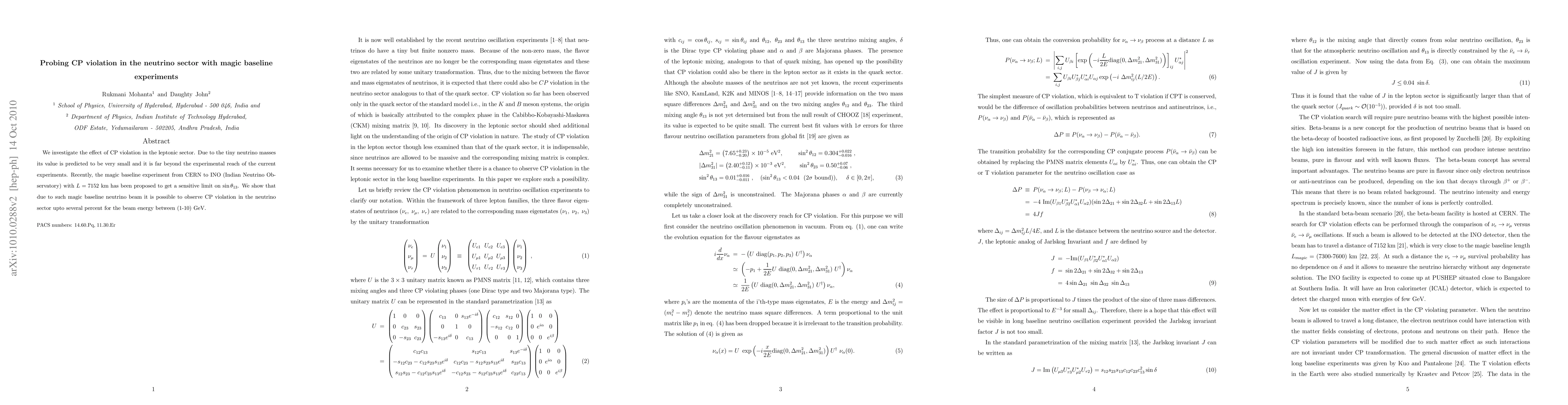 This paper explores the potential for observing CP violation in the neutrino sector using a proposed magic baseline experiment from CERN to the Indian Neutrino Observatory (INO) over a distance of 7152 km. The study demonstrates that this setup can detect CP violation at the several percent level for neutrino beam energies between 1-10 GeV.