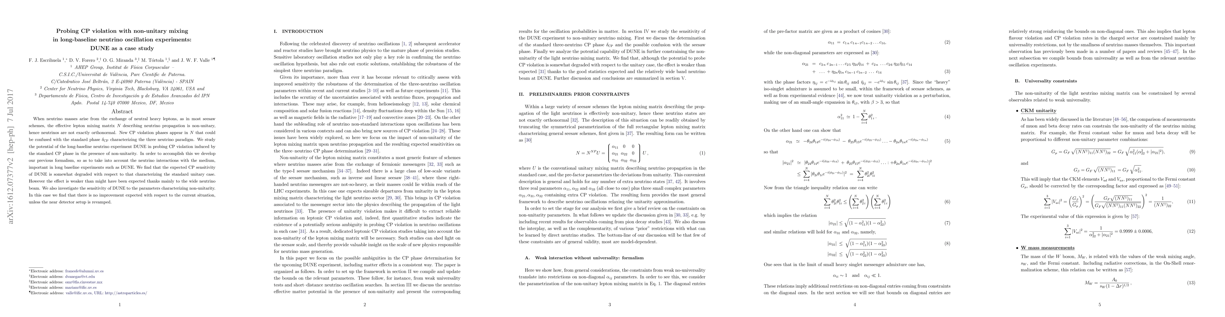 When neutrino masses arise from the exchange of neutral heavy leptons, as in most seesaw schemes, the effective lepton mixing matrix $N$ describing neutrino propagation is non-unitary, hence neutrinos are not exactly orthonormal. New CP violation phases appear in $N$ that could be confused with the standard phase $\delta_{\text{CP}}$ characterizing the three neutrino paradigm. We study the potential of the long-baseline neutrino experiment DUNE in probing CP violation induced by the standard CP phase in the presence of non-unitarity. In order to accomplish this we develop our previous formalism, so as to take into account the neutrino interactions with the medium, important in long baseline experiments such as DUNE. We find that the expected CP sensitivity of DUNE is somewhat degraded with respect to that characterizing the standard unitary case. However the effect is weaker than might have been expected thanks mainly to the wide neutrino beam. We also investigate the sensitivity of DUNE to the parameters characterizing non-unitarity. In this case we find that there is no improvement expected with respect to the current situation, unless the near detector setup is revamped.