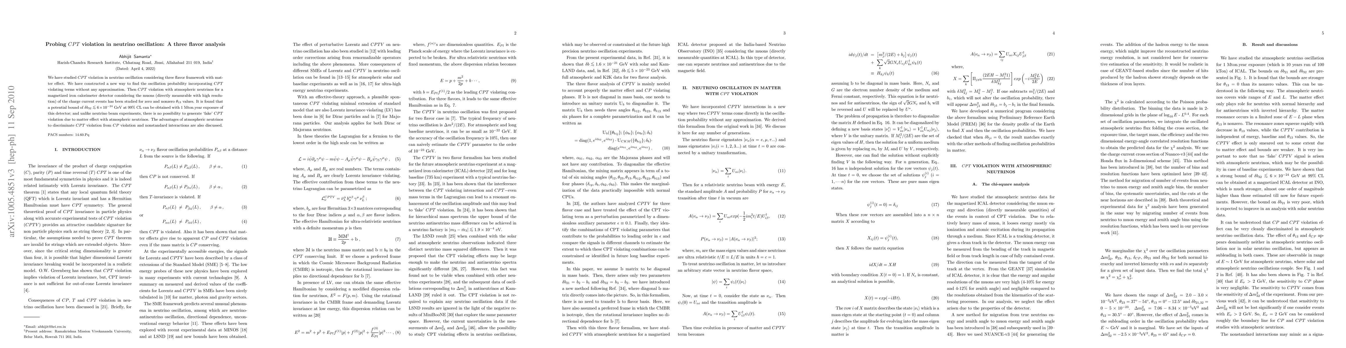 This paper investigates $CPT$ violation in neutrino oscillations using a three-flavor framework, incorporating matter effects and a novel method to include $CPT$ violating terms. It finds potential bounds on $\delta b_{32}$ with atmospheric neutrinos in a magnetized iron detector, highlighting the advantages of this approach over beam experiments.