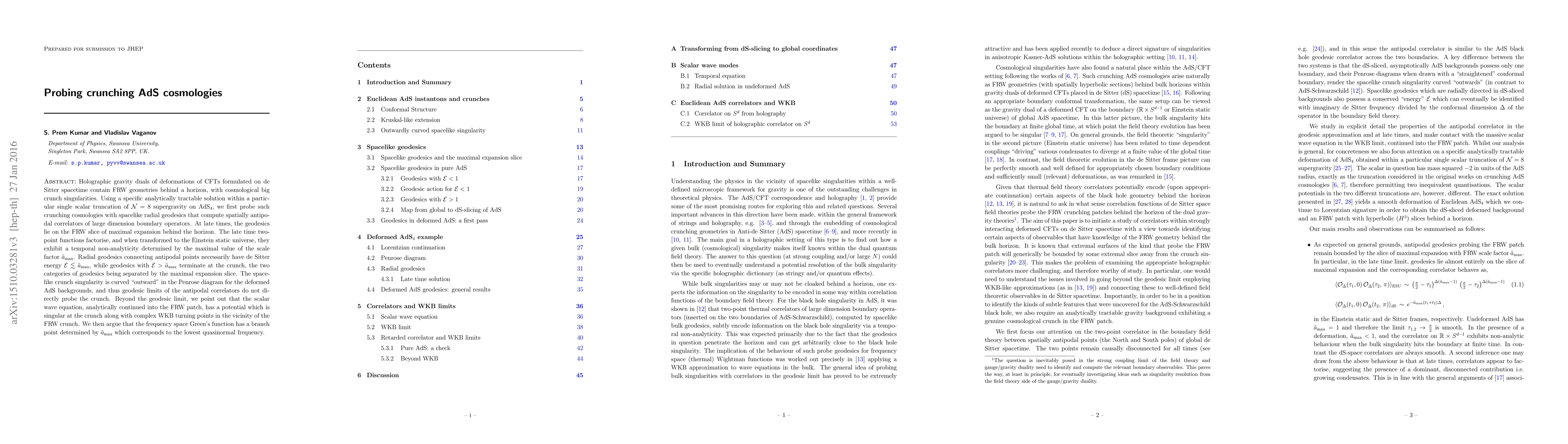 Holographic gravity duals of deformations of CFTs formulated on de Sitter spacetime contain FRW geometries behind a horizon, with cosmological big crunch singularities. Using a specific analytically tractable solution within a particular single scalar truncation of N=8 supergravity on AdS_4, we first probe such crunching cosmologies with spacelike radial geodesics that compute spatially antipodal correlators of large dimension boundary operators. At late times, the geodesics lie on the FRW slice of maximal expansion behind the horizon. The late time two-point functions factorise, and when transformed to the Einstein static universe, they exhibit a temporal non-analyticity determined by the maximal value of the scale factor a_{max} . Radial geodesics connecting antipodal points necessarily have de Sitter energy E \leq a_{max}, while geodesics with E > a_{max} terminate at the crunch, the two categories of geodesics being separated by the maximal expansion slice. The spacelike crunch singularity is curved "outward" in the Penrose diagram for the deformed AdS backgrounds, and thus geodesic limits of the antipodal correlators do not directly probe the crunch. Beyond the geodesic limit, we point out that the scalar wave equation, analytically continued into the FRW patch, has a potential which is singular at the crunch along with complex WKB turning points in the vicinity of the FRW crunch. We then argue that the frequency space Green's function has a branch point determined by a_{max} which corresponds to the lowest quasinormal frequency.