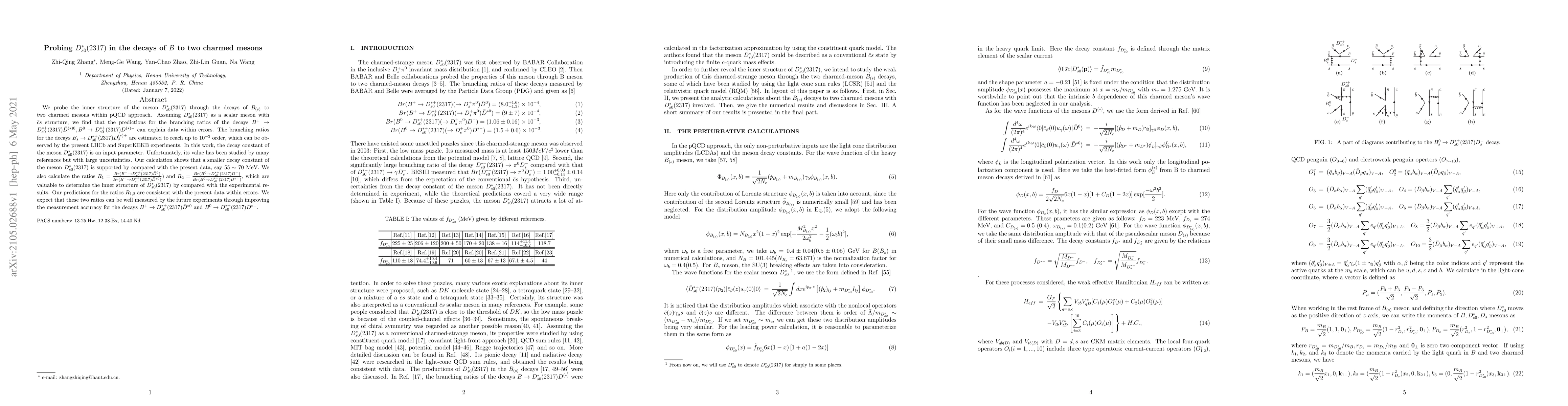 This research investigates the $D^*_{s0}(2317)$ meson's structure via $B_{(s)}$ decays to two charmed mesons using a pQCD approach. Predictions for branching ratios of certain decays align with experimental data, suggesting a scalar meson with $\bar cs$ structure. Ratios $R_1$ and $R_2$ are calculated to further determine the $D^*_{s0}(2317)$'s inner structure and are consistent with current data, with future experiments expected to refine these measurements.