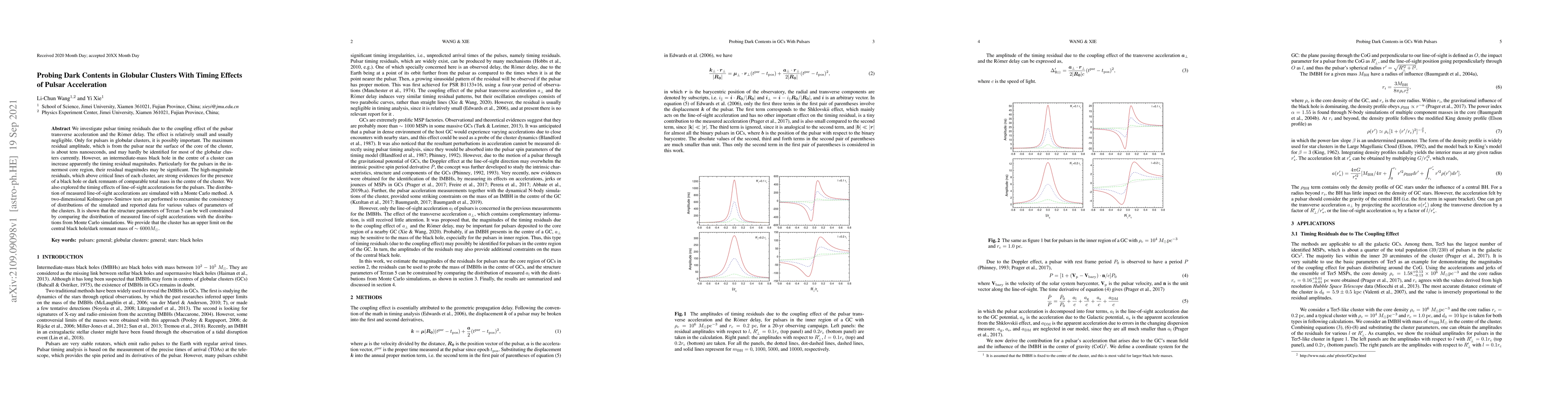 This paper explores pulsar timing residuals in globular clusters, suggesting that significant timing effects near the cluster core may indicate the presence of an intermediate-mass black hole or dark remnants. The study uses Monte Carlo simulations to constrain the structure parameters of Terzan 5, finding an upper limit of about 6000 solar masses for the central black hole/dark remnant mass.