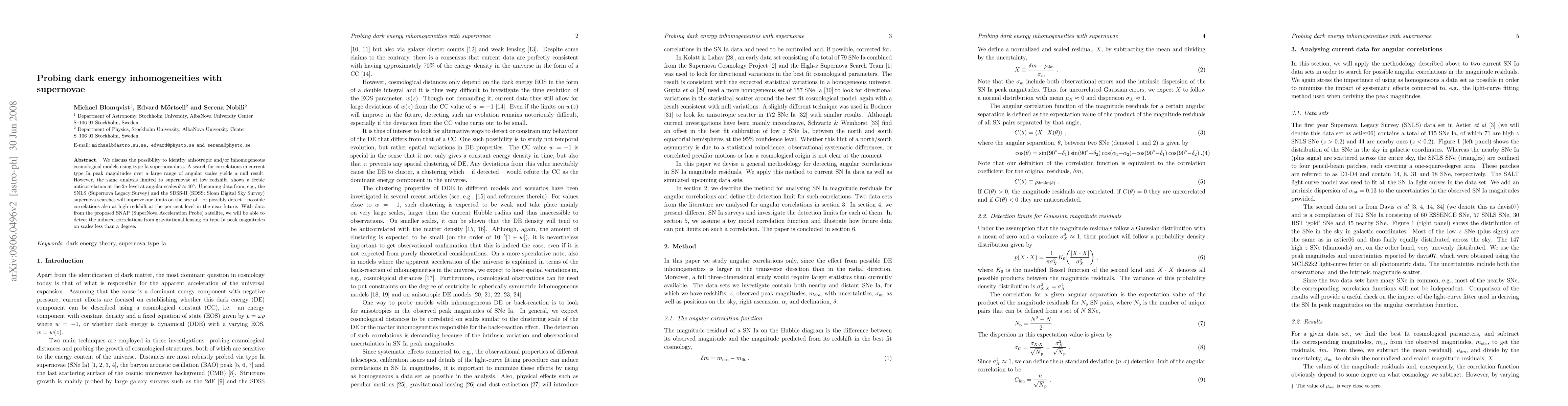 We discuss the possibility to identify anisotropic and/or inhomogeneous cosmological models using type Ia supernova data. A search for correlations in current type Ia peak magnitudes over a large range of angular scales yields a null result. However, the same analysis limited to supernovae at low redshift, shows a feeble anticorrelation at the two sigma level at angular scales of about 40 degrees. Upcoming data from, e.g., the SNLS (Supernova Legacy Survey) and the SDSS-II (SDSS: Sloan Digital Sky Survey) supernova searches will improve our limits on the size of - or possibly detect - possible correlations also at high redshift at the per cent level in the near future. With data from the proposed SNAP (SuperNova Acceleration Probe) satellite, we will be able to detect the induced correlations from gravitational lensing on type Ia peak magnitudes on scales less than a degree.