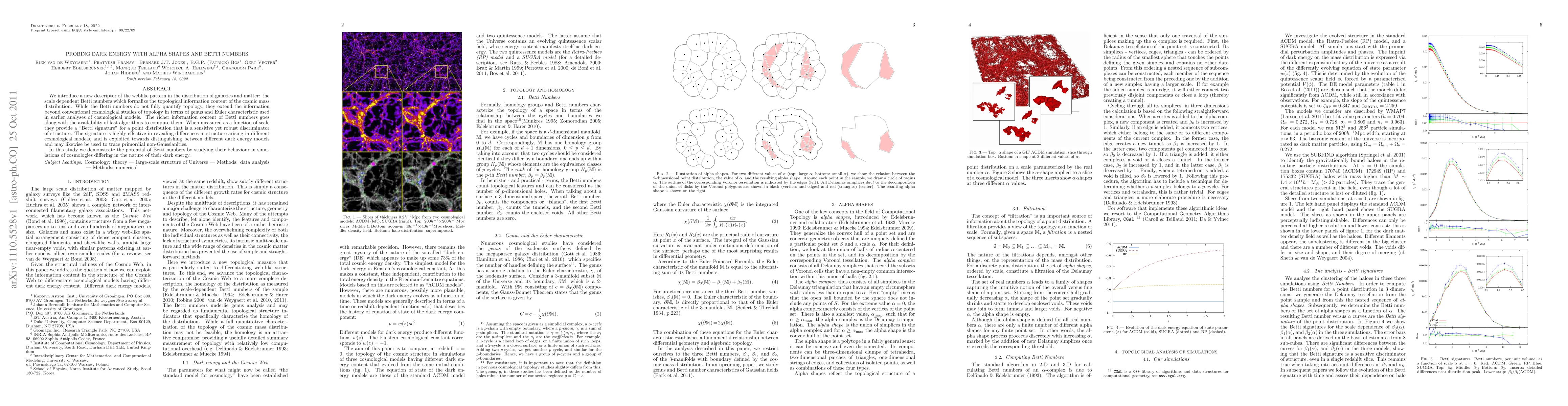 We introduce a new descriptor of the weblike pattern in the distribution of galaxies and matter: the scale dependent Betti numbers which formalize the topological information content of the cosmic mass distribution. While the Betti numbers do not fully quantify topology, they extend the information beyond conventional cosmological studies of topology in terms of genus and Euler characteristic used in earlier analyses of cosmological models. The richer information content of Betti numbers goes along with the availability of fast algorithms to compute them. When measured as a function of scale they provide a "Betti signature" for a point distribution that is a sensitive yet robust discriminator of structure. The signature is highly effective in revealing differences in structure arising in different cosmological models, and is exploited towards distinguishing between different dark energy models and may likewise be used to trace primordial non-Gaussianities. In this study we demonstrate the potential of Betti numbers by studying their behaviour in simulations of cosmologies differing in the nature of their dark energy.
