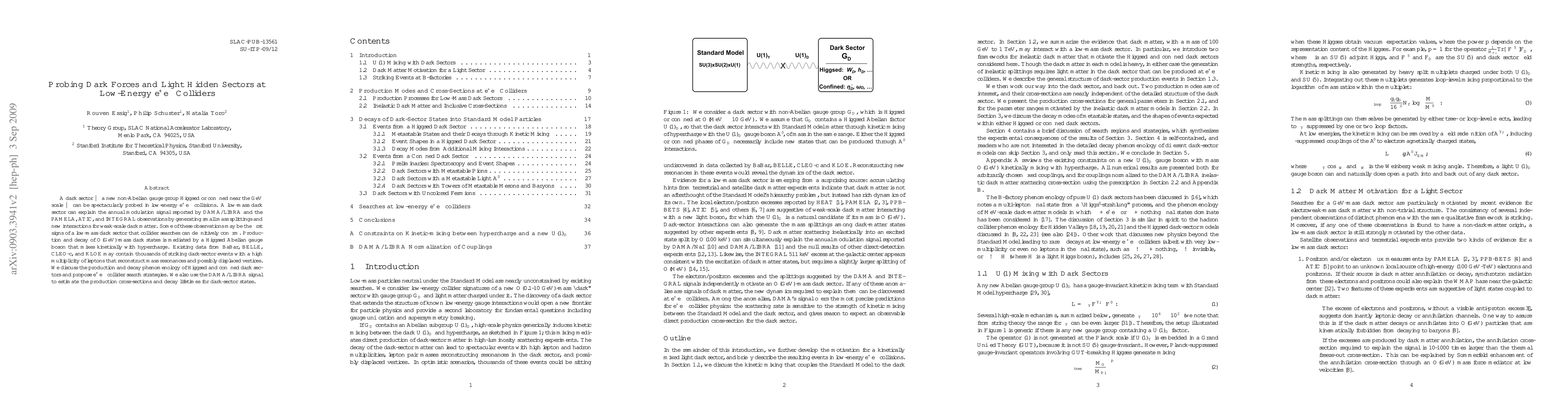 A dark sector -- a new non-Abelian gauge group Higgsed or confined near the GeV scale -- can be spectacularly probed in low-energy e+e- collisions. A low-mass dark sector can explain the annual modulation signal reported by DAMA/LIBRA and the PAMELA, ATIC, and INTEGRAL observations by generating small mass splittings and new interactions for weak-scale dark matter. Some of these observations may be the first signs of a low-mass dark sector that collider searches can definitively confirm. Production and decay of O(GeV)-mass dark states is mediated by a Higgsed Abelian gauge boson that mixes kinetically with hypercharge. Existing data from BaBar, BELLE, CLEO-c, and KLOE may contain thousands of striking dark-sector events with a high multiplicity of leptons that reconstruct mass resonances and possibly displaced vertices. We discuss the production and decay phenomenology of Higgsed and confined dark sectors and propose e+e- collider search strategies. We also use the DAMA/LIBRA signal to estimate the production cross-sections and decay lifetimes for dark-sector states.
