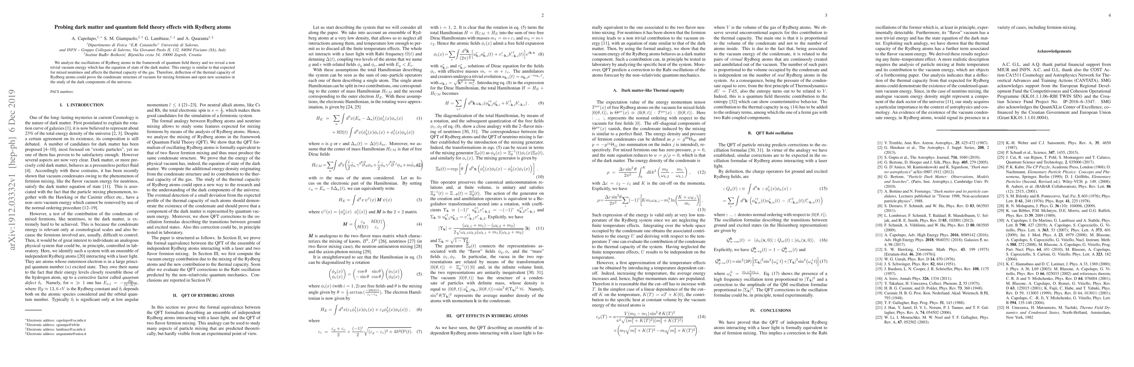 This paper investigates Rydberg atoms' oscillations to reveal non-trivial vacuum energy mimicking dark matter's equation of state, suggesting a potential link between quantum field theory and dark matter. The findings propose that changes in Rydberg atoms' thermal capacity could indicate the vacuum's condensate structure for mixed fermions.