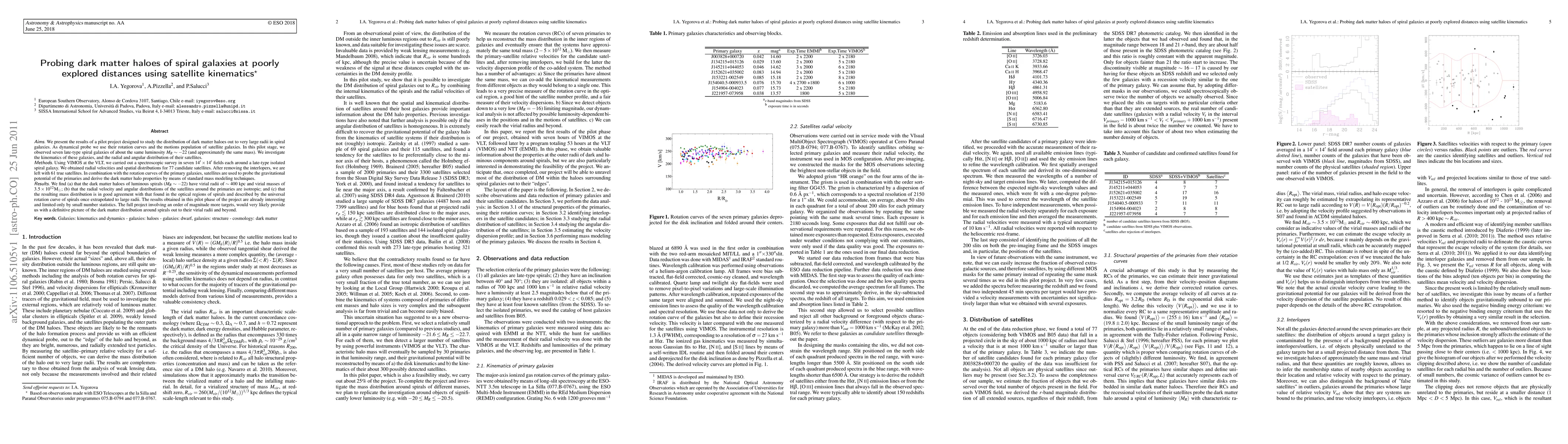 We present the results of a pilot project designed to study the distribution of dark matter haloes out to very large radii in spiral galaxies. As dynamical probe we use their rotation curves and the motions population of satellite galaxies. In this pilot stage, we observed seven late-type spiral galaxies of about the same luminosity M_R ~ -22 (and approximately the same mass). We investigate the kinematics of these galaxies, and the radial and angular distribution of their satellites. Using VIMOS at the VLT, we carried out a spectroscopic survey in seven 14' x 14' fields each around a late-type isolated spiral galaxy. We obtained radial velocities and spatial distributions for 77 candidate satellites. After removing the interlopers, we are left with 61 true satellites. In combination with the rotation curves of the primary galaxies, satellites are used to probe the gravitational potential of the primaries and derive the dark matter halo properties by means of standard mass modeling techniques. We find (a) that the dark matter haloes of luminous spirals (M_R ~ -22) have virial radii of ~400 kpc and virial masses of 3.5 x 10^12 Msun; (b) that the radial velocity and angular distributions of the satellites around the primaries are isotropic; and (c) that the resulting mass distribution is in good agreement with that found in the optical regions of spirals and described by the universal rotation curve of spirals once extrapolated to large radii. The results obtained in this pilot phase of the project are already interesting and limited only by small number statistics. The full project involving an order of magnitude more targets, would very likely provide us with a definitive picture of the dark matter distribution around spirals out to their virial radii and beyond.