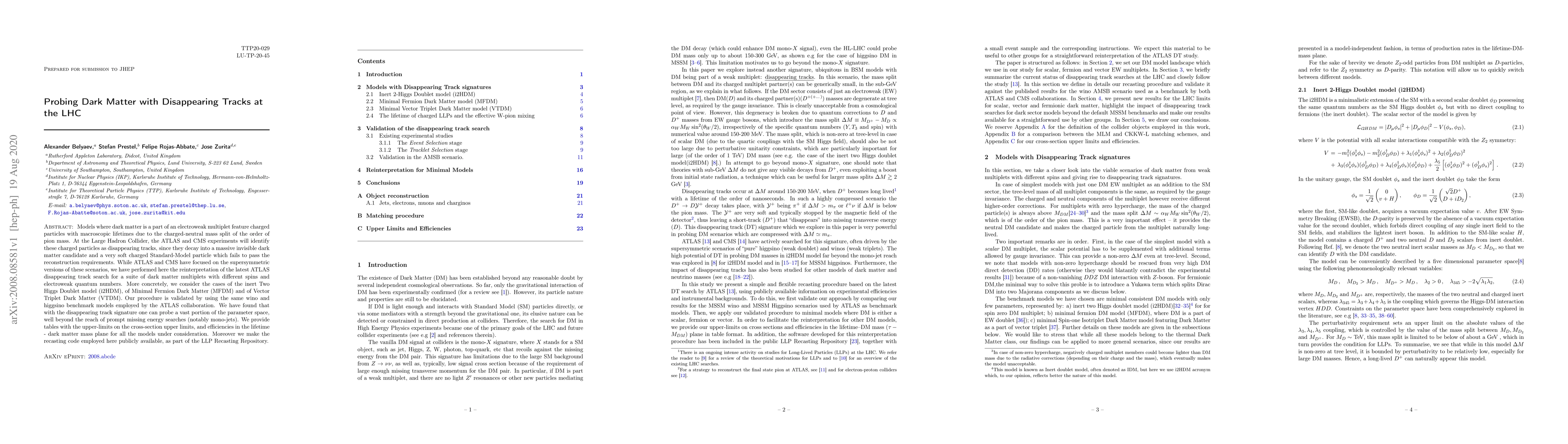 Models where dark matter is a part of an electroweak multiplet feature charged particles with macroscopic lifetimes due to the charged-neutral mass split of the order of pion mass. At the Large Hadron Collider, the ATLAS and CMS experiments will identify these charged particles as disappearing tracks, since they decay into a massive invisible dark matter candidate and a very soft charged Standard-Model particle which fails to pass the reconstruction requirements. While ATLAS and CMS have focused on the supersymmetric versions of these scenarios, we have performed here the reinterpretation of the latest ATLAS disappearing track search for a suite of dark matter multiplets with different spins and electroweak quantum numbers. More concretely, we consider the cases of the inert Two Higgs Doublet model (i2HDM), of Minimal Fermion Dark Matter (MFDM) and of Vector Triplet Dark Matter (VTDM). Our procedure is validated by using the same wino and higgsino benchmark models employed by the ATLAS collaboration. We have found that with the disappearing track signature one can probe a vast portion of the parameter space, well beyond the reach of prompt missing energy searches (notably mono-jets). We provide tables with the upper-limits on the cross-section upper limits, and efficiencies in the lifetime - dark matter mass plane for all the models under consideration. Moreover we make the recasting code employed here publicly available, as part of the LLP Recasting Repository.