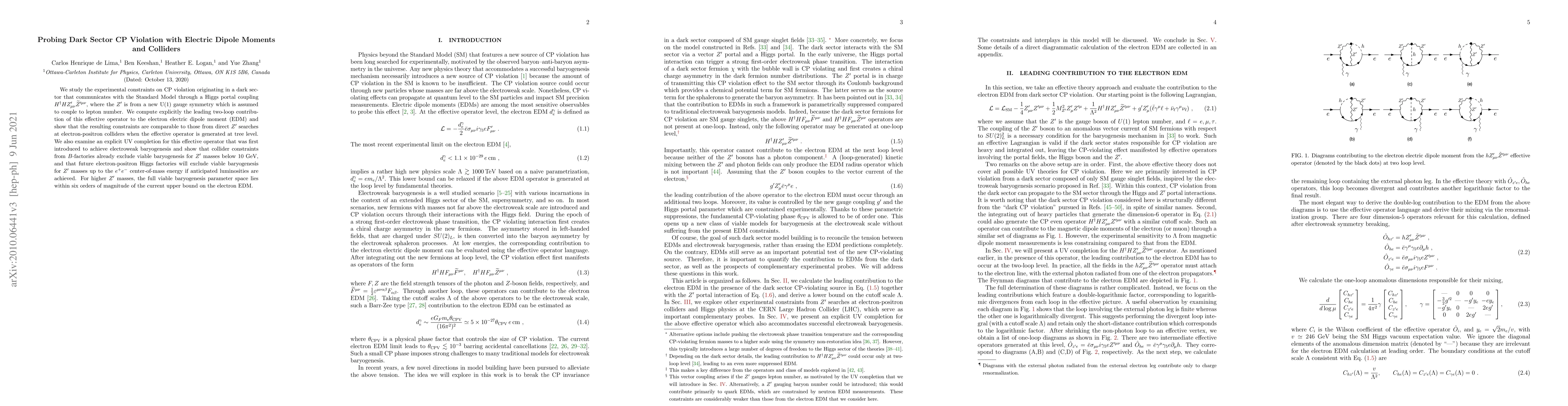 We study the experimental constraints on dark sector CP violation that enters the visible sector through a Higgs portal coupling $H^{\dagger} H Z^{\prime}_{\mu\nu} \widetilde Z^{\prime \mu\nu}$, where the $Z^{\prime}$ is from a new U(1) gauge symmetry which is assumed to couple to lepton number. We compute explicitly the leading two-loop contribution of this effective operator to the electron electric dipole moment (EDM) and show that the resulting constraints are comparable to those from direct $Z^{\prime}$ searches at electron-positron colliders when the effective operator is generated at tree level. We also examine an explicit UV completion for this effective operator that was first introduced to achieve electroweak baryogenesis and show that collider constraints from $B$-factories already exclude viable baryogenesis for $Z^{\prime}$ masses below 10 GeV, and that future electron-positron Higgs factories will exclude viable baryogenesis for $Z^{\prime}$ masses up to the $e^+e^-$ center-of-mass energy if anticipated luminosities are achieved. For higher $Z^{\prime}$ masses, the full viable baryogenesis parameter space lies within six orders of magnitude of the current upper bound on the electron EDM.