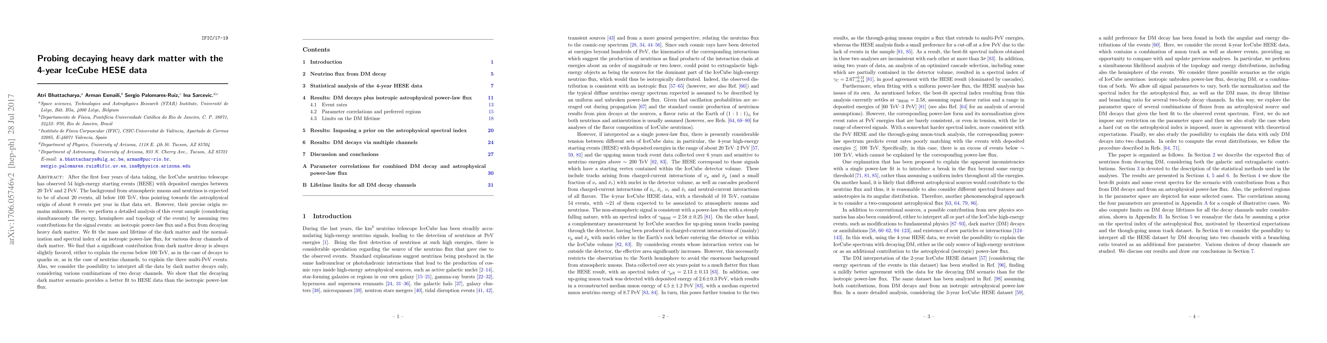 The study analyzes 4-year IceCube HESE data, considering energy, hemisphere, and topology of events, to probe decaying heavy dark matter alongside an isotropic power-law astrophysical flux.